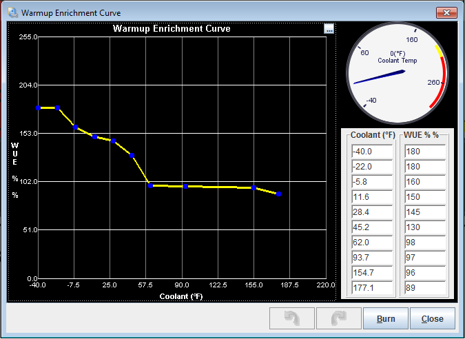 The idea is just to add some fuel when the temps are colder to keep the AFRs a little fatter during warm-up. I aim for high twelves under 100°F and mid 13s above, where I taper it off as I get closer to 160°F so I idle back at 14.5 smoothly.