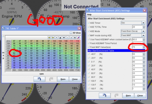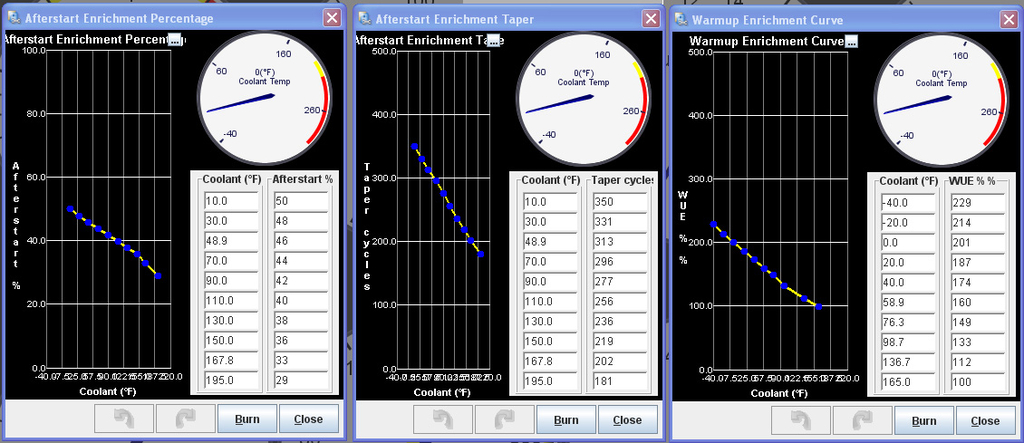 The problem I've been having has to do with the cranking and ASE maps. Specifically, it doesn't want to start worth a ---- or stay running in the ASE window, but once it transitions over to WUE, it works perfectly.