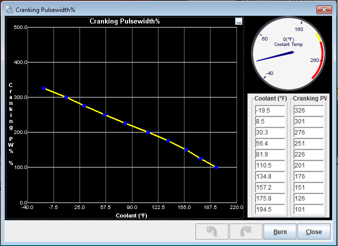 1. Cranking Settings/Pulsewidths: These settings are in milliseconds of fuel injector pulse widths. They cover the time period from when you first turn the key until the engine fires (the MS considers the engine to have fired when RPM exceeds "Cranking RPM"). For comparison purposes, look at pulse width duration and size of the injector. In addition, don't forget that injector dead times can vary.