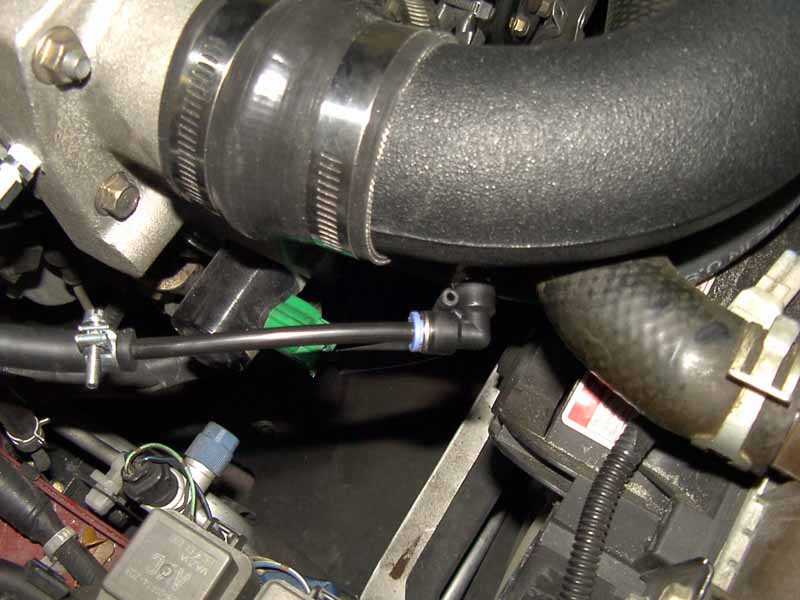 That is the 1 gallon DO tank I got from WOT. I dont go through that much fluid, so 1 gallon is plenty...There is a hole in a tab that is located behind the carpet where the bottle is mounted. I went to home depot and got a flat L bracket, bolted it to the bottle, then used a bolt, nut and washers to secure it to the body. It doesnt move and no permanent damage to the area. I ran the water line behind the carpet, behind the battery and to the pump. The relay, wiring and switch are located behind the battery cover. The pump is mounted to 3/4 piece of ply, painted black and secured with the spare tire bolt. Nice and tidy. The line to the intake is run from the truck through a grommet by the antenna. From there is follows the brake lines under the car to the front of the motor. The line is secured by the brake line brackets, and then secured in the engine bay with a couple of zip ties to make sure it stays put.