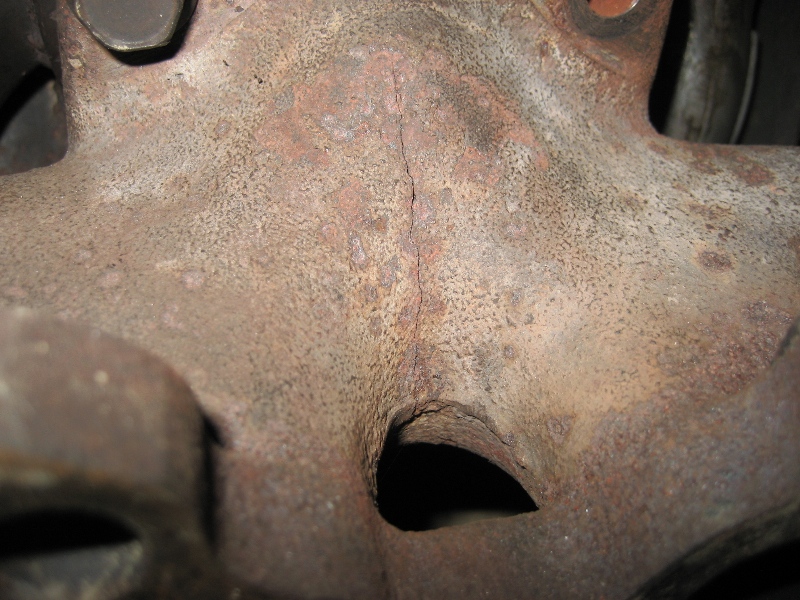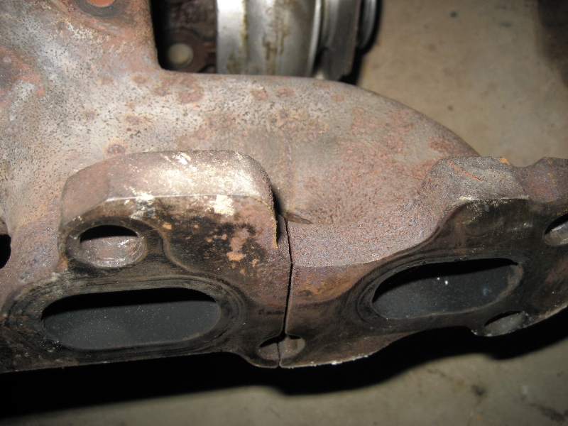 Hairline crack between exh port 1-2 and port 2-3. I believe it's weldable if you preheat the manifold in an oven to 500+degree, welding it, and then droping it in some sand to let it cool slowly. I can do it, but i think the buyer should get it done so quality of the weld can be assured. Some more pictures of crack when i get home.
