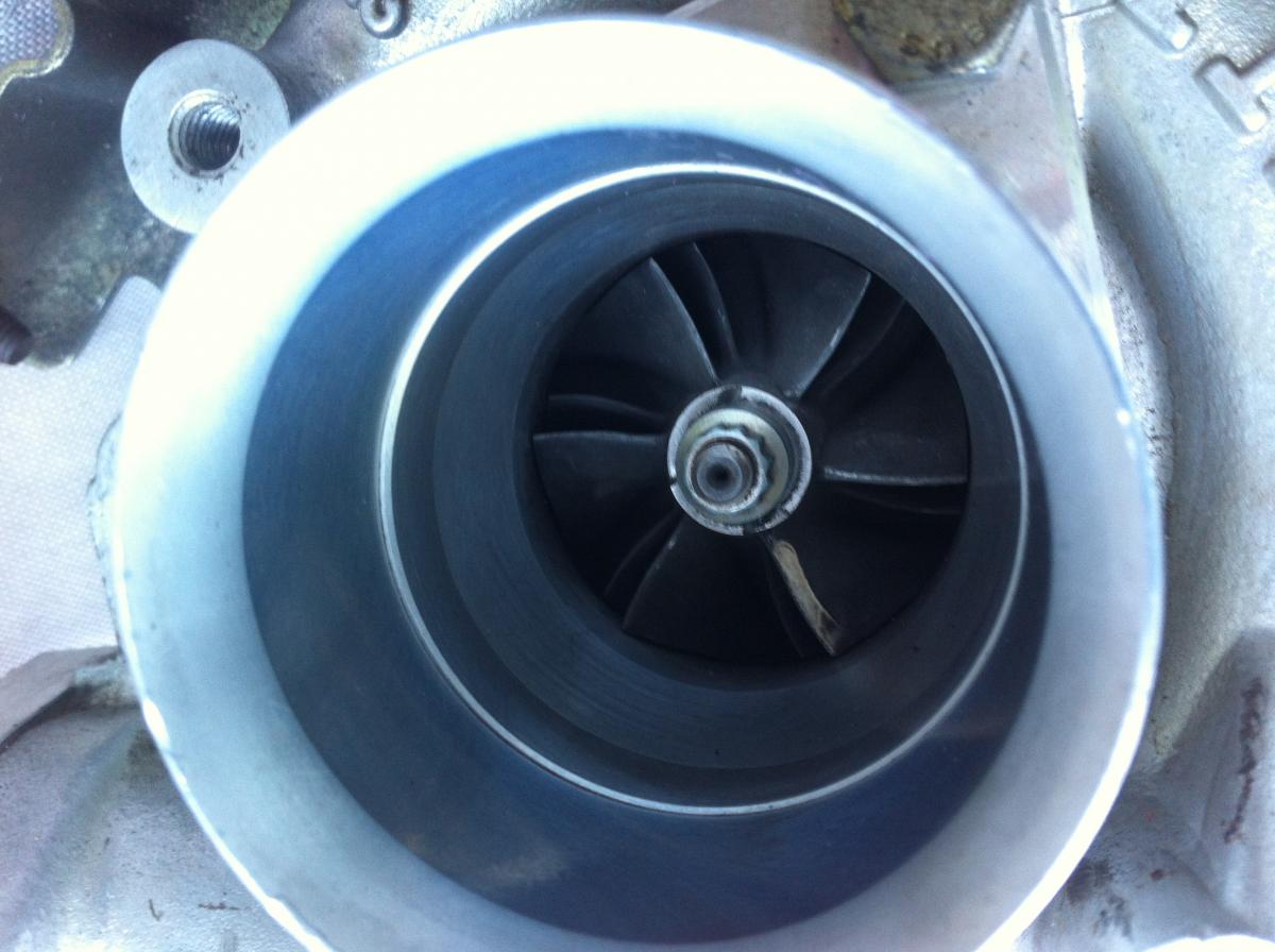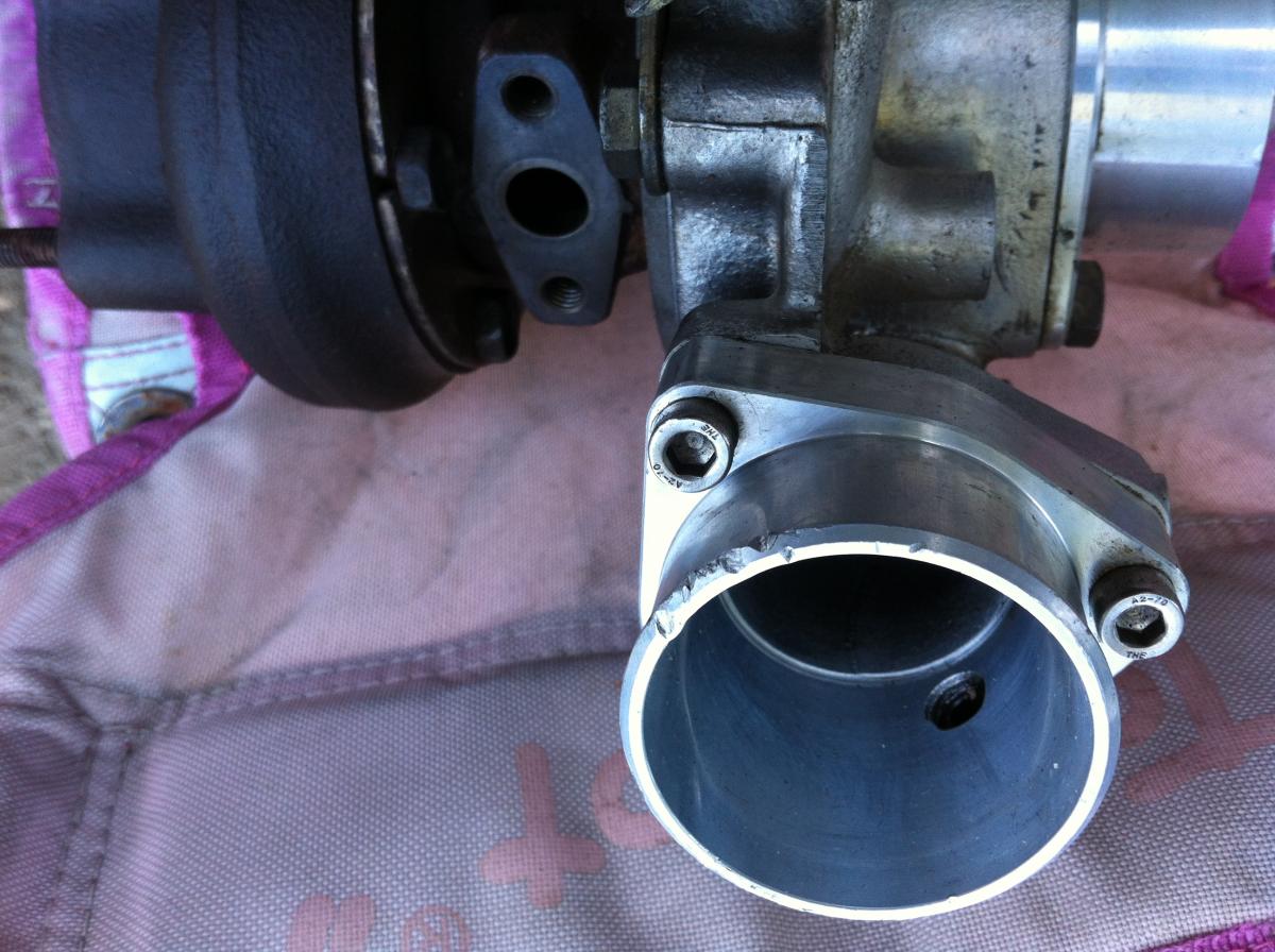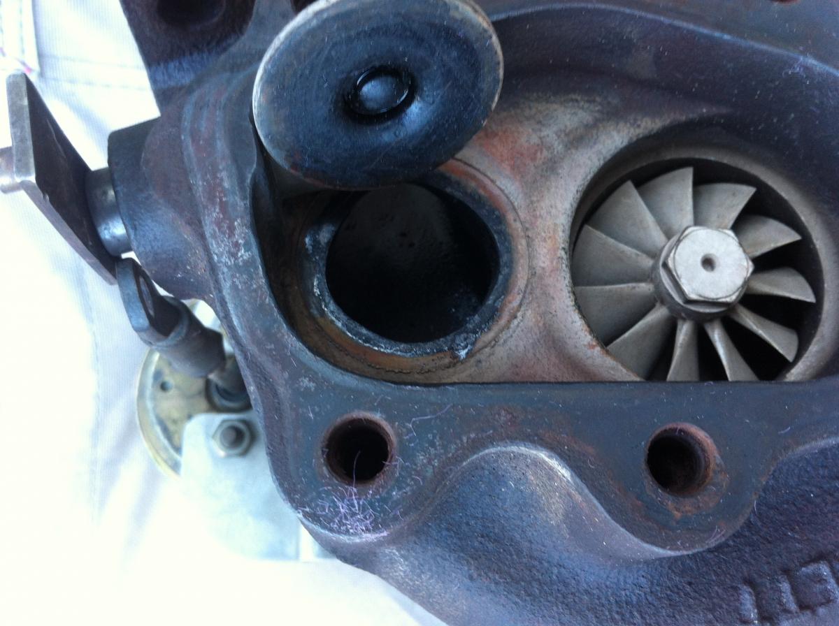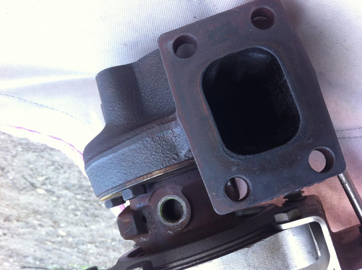 Turbo has been sitting for a year so its dry and the shaft has play in both directions, the blades are in good condition. The housing has been ported. I took it to Alamo turbo here in town and they said well it doesnt seem that bad, perhaps run it in your new motor and see if it was the motor dying (low compression from bad valvetrain/rings) that caused it to boost slowly. After getting the motor apart I had bent rods so for sure there was motor issues. The turbo never made any blade noise and spun down ok so there was no clear verdict on its condition. Bottom line is that it may or may not be ok. I was going to put it back in but since I'm going forged I'm looking at a turbo with more potential so I'm not going to bother. It may be great for years or it may be in need of a CHRA. I'm pricing it a $300. I may or may not need the hose adaptors on it, I will know shortly based on my new used Disco I hope to aquire.