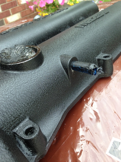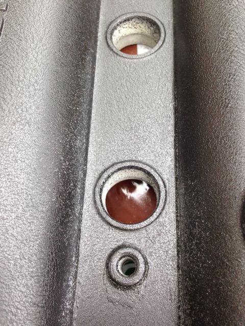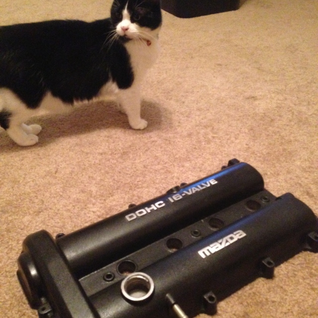 First up is a 1.8 valve cover. This came on my car when I bought it and it was terribly caked with white paint. I sanded it as best as I could, and even used a wire brush in some spots. VHT wrinkle coat followed, and it's not perfect but I'd say it's a solid 8/10, from normal viewing distance looking at an engine bay you wouldn't think it was messed up. I would comfortably put it on my own car. Plug wire holders can be included but they are still disgusting white. Since pics taken, the lettering was sanded for the brushed aluminum look.