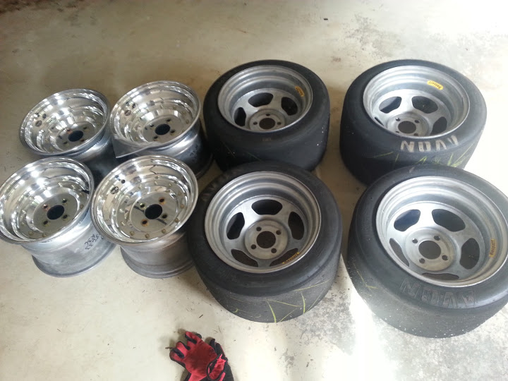 13x10 REAL Racing aluminum wheels , 6" backspace, that have maybe a half dozen events on them. They already have a set of Avons mounted on them.