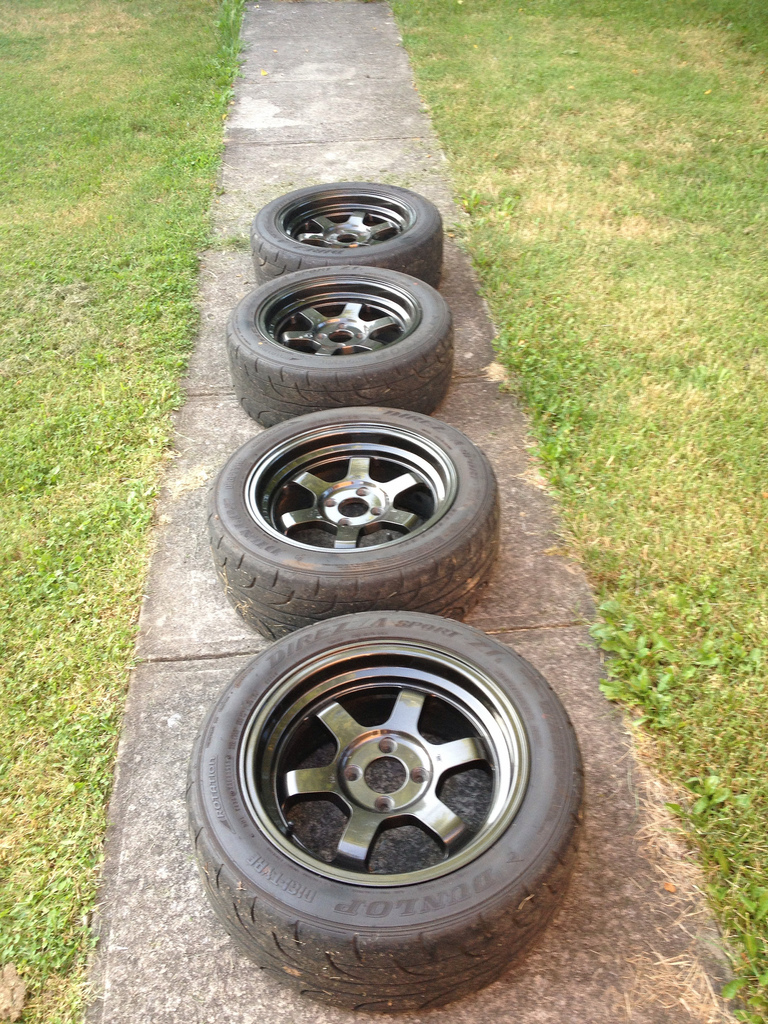 They were mounted on my Mazdaspeed miata and my previous NA. In the pictures they have 205/50/15's mounted. (they do not come with tires)