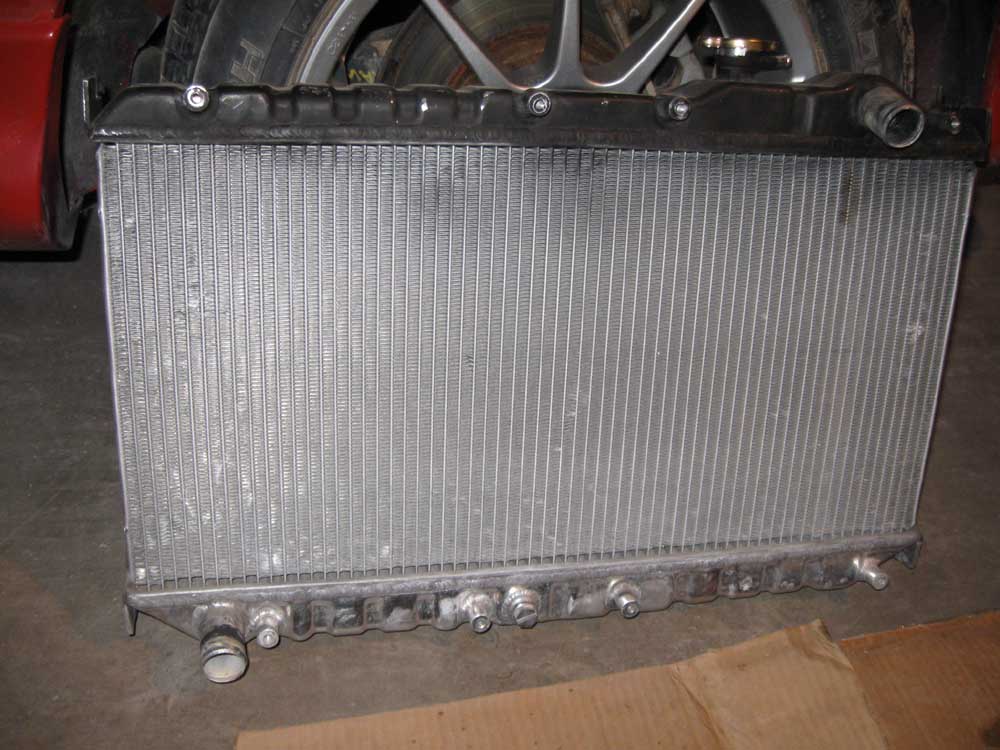 This radiator was on my turbo miata for two years and worked great. Fits 1990-97 cars. I sold the car and need to get rid of this radiator. With a 180* thermostat, the highest coolant temp recorded was 186* after a 20 min track session. This radiator will solve your cooling problems! It is a tight squeeze, and you will have to trim some of the plastic from the lower fan shroud. It is all aluminum, purchased from coolradiator.com. Comes with a 16 psi cap and mounting brackets. The top tank was painted flat black to make it more discrete.