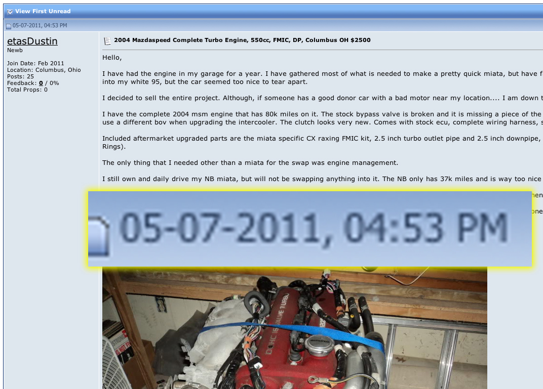 I have had the engine in my garage for a year. I have gathered most of what is needed to make a pretty quick miata, but have failed to find a good donor miata to do the swap with. I originally was going to swap it into my white 95, but the car seemed too nice to tear apart.