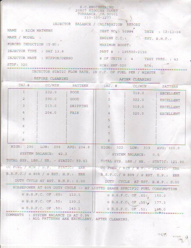 I usually send my injectors to cleaninjectors.com, but I figured I'd try RC Eng for a change. I am going to use cleaninjectors.com most of the time since their service is excellent and the price is really good. Yea I was surprised at the before cleaning flow.