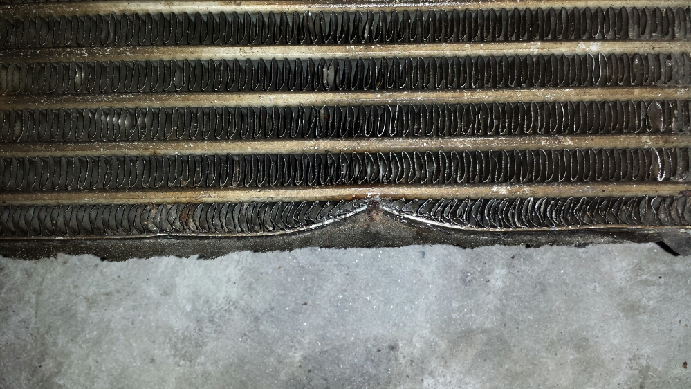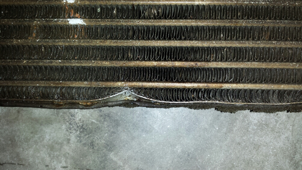 The three spots that are compressed on the bottom are where the undertray makes contact with the cooler. The oil carrying passage is not damaged or pinched. See the closeup pics.