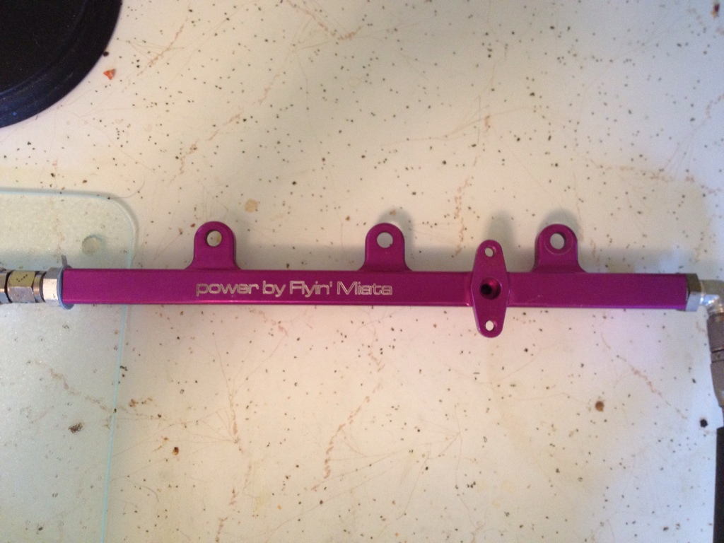 94-97 Flyin Miata dual feed rail, stainless braided lines, A/N fittings, JEGS pressure gauge mounted inline, 220.00