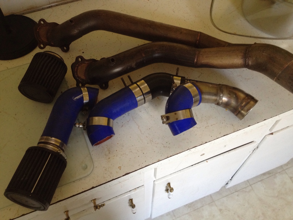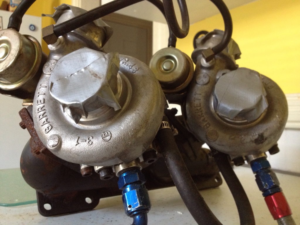 Absurdflow twin turbo setup, for 1.8L, comes with everything you'll need to do weekend install (oil lines, fittings, coolant lines with banjo fittings, filters, hardware) except for the oil drain fittings that go into the oil pan they are already installed. I will sell the pan for another 40. Kit includes manifold, two Garrett 1548 turbos with approximately 20k on them, downpipe with bung for wideband sensor, 3" exhaust out. Kit cost 60 bucks to ship from Texas to NC in fall of 2010. 1000.00