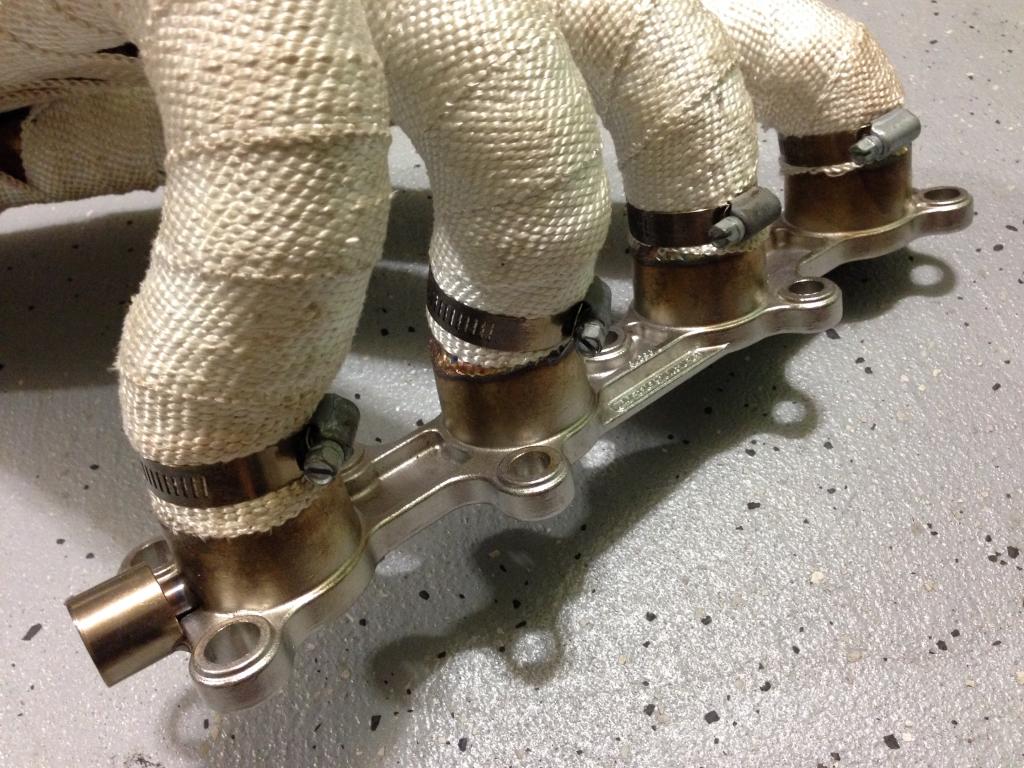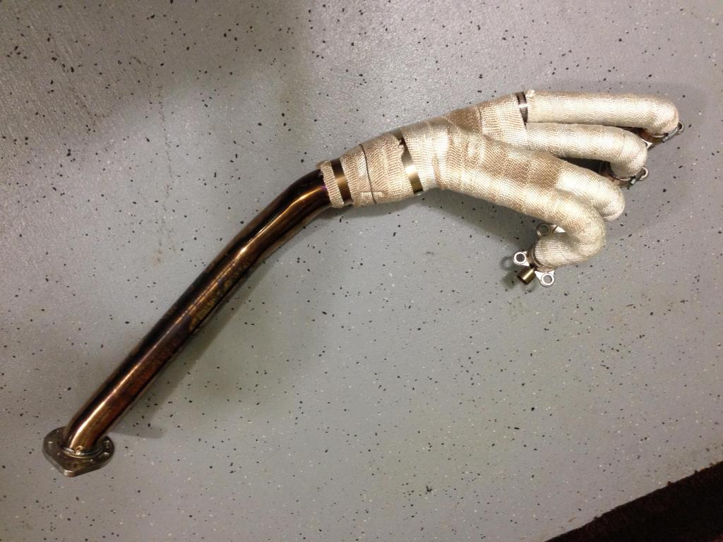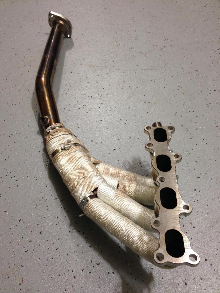 "Racing Beat 99-00 4 into 1 header. With inlet for 99-00 type egr tube and one o2 bung right behind where the 4 pipes meet together. I wrapped the header the day I got it, I think it's been through one wet autocross so the mirror finish has little speckles where it's not wrapped. Still looks better and outperforms your oem exhaust mani."