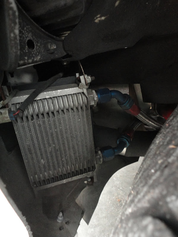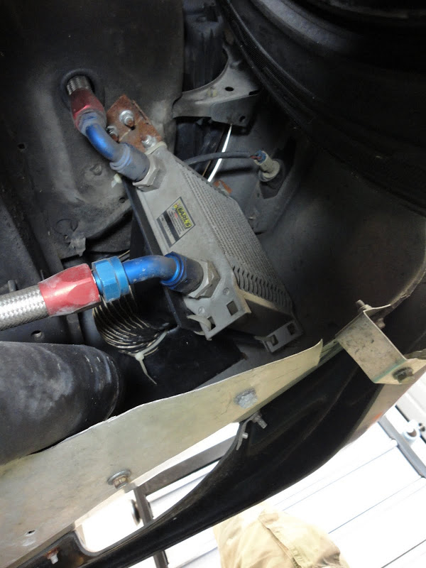 Second oil cooler mounted in front of passenger side wheel. Note the oil line plumbed from above:
