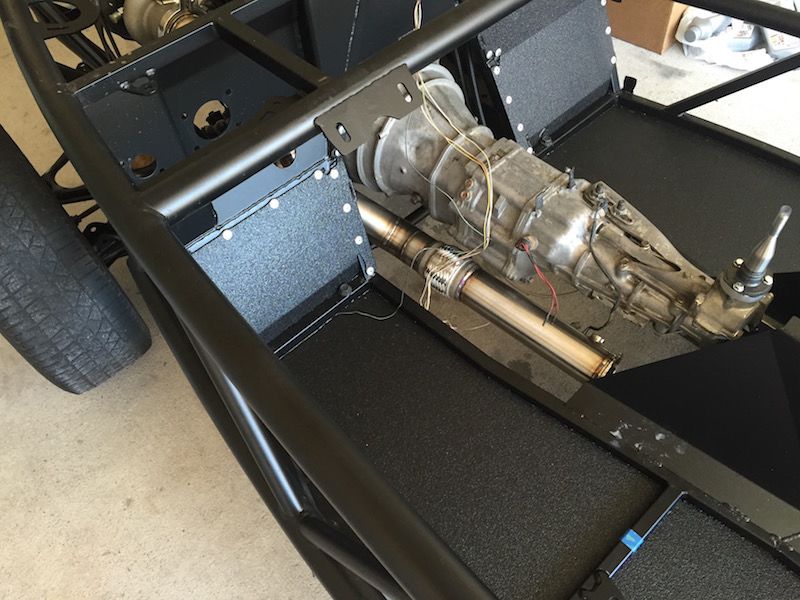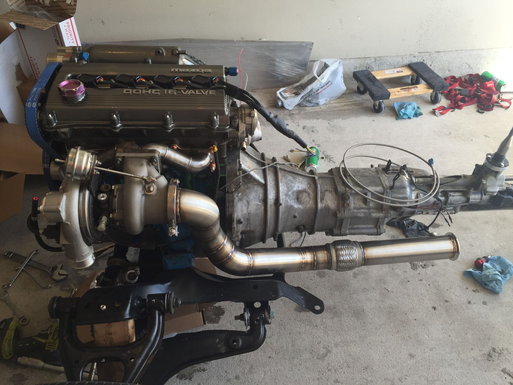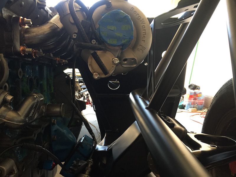 here are a few pics of it mounted, will have more room on the side in a miata. Also there was mention by Abe the rear "shelf" may need to me modded a bit for the downpipe. I'll email to verify.