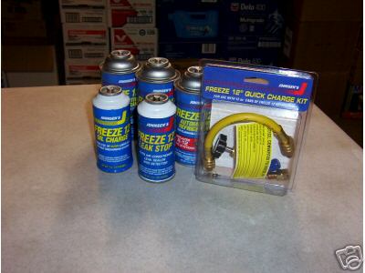 Full kit of Freeze 12, The kit consists of (3) cans of Freeze 12 Refrigerant, (1) can of Oil Charge, (1) can of Leak Sealer and Detector, and (1) Freeze 12 Quick Charge Kit which has all the Charging tools, Hose, Fittings, Label and Instuctions that you'll need... SOLD