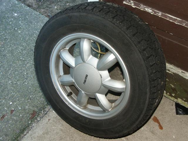 Some pics of the tires for sale. They have about 4/32 - 5/32 of thread left. Good for one or two more seasons, depending on how long you drive on them. I am also including the shortie lug nuts to be used with these rims.