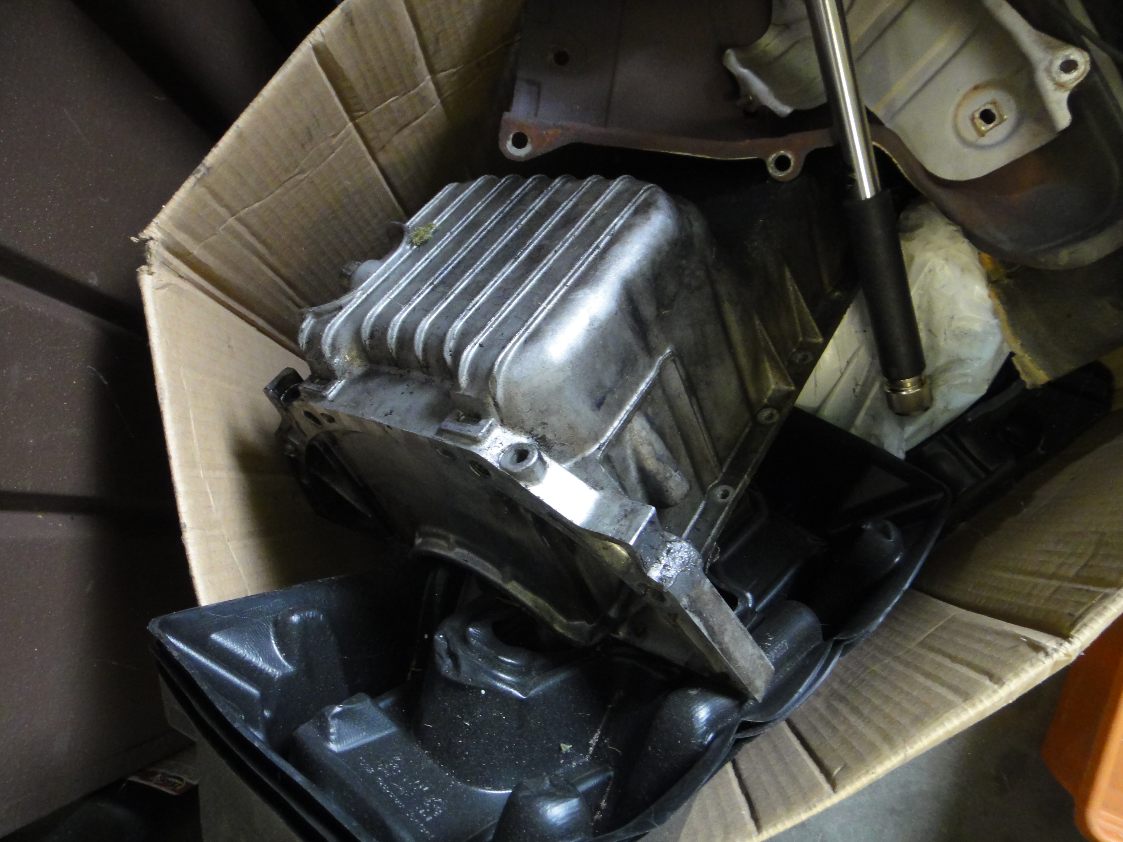 - Busted oil pan, has a crack near one of the long bolts, can be TIG welded and used - $30