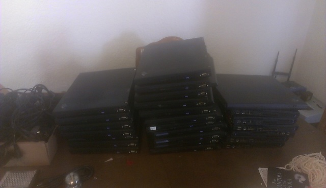 A quick survey shows 26 T4x series machines in the one pile, that's T40, T41, T42 and T43 units. Unfortunately I only have about 14 T4x series power bricks, so that limits things. I may have more in a box somewhere. I'd be happy to throw Ubuntu on them and sell them off cheap. I could install XP on them but I'd charge extra because I hate installing XP and it takes for fricking ever.
