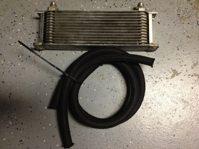I've upgraded my oil cooler so I'm selling off this one. It's an Earl's 13 row aluminum wide oil cooler, part #41308. It's in good shape and doesn't leak, however it is used. It comes with -8 male fittings. I also have 2 sections of Fragola Series 8000 push lock hose nylon braided hose, one piece 30 inches long and the other 40 inches long. Just as an FYI, Fragola lists this hose as a -8 fitment however it was a bit smaller than true -8 so if you buy it, I recommend you purchase Fragola fittings. Must be a Euro thing. My XRP -8 fittings didn't fit.