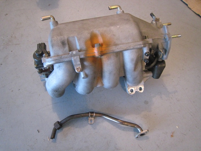 '99 intake manifold with EGR valve, VICS solenoid and VICS actuator. The plenum gasket is missing. $80 $70.