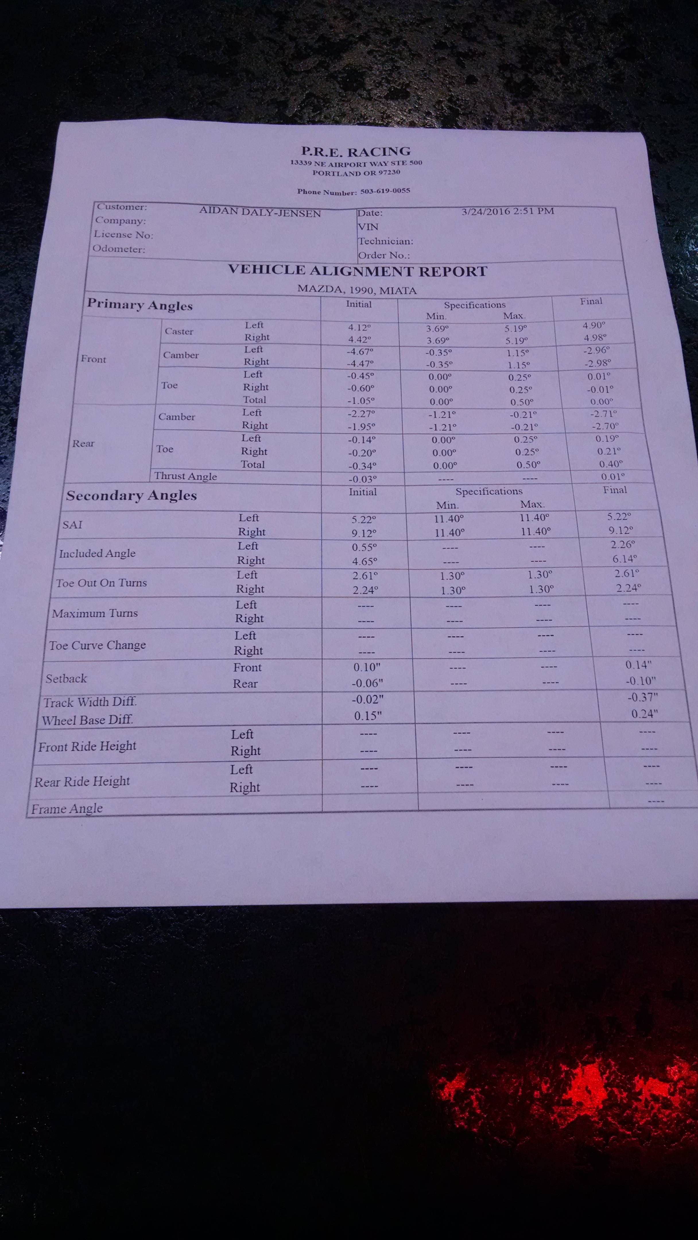 How did it work? Great. We were able to dial in a solid 3.5 degrees of camber into the front of an NA at 4.7" pinch height with adjustment to spare. Everything has good clearance for the suspension to work. I took it out on track on some dead RS-3's and got within 1.3 seconds of my PB on R-Comps. The car felt a lot looser (loose is fast), which means the front is gripping better. I've been struggling with premature front tire wear at the outer edge -- so I'm looking forward to improved tire life. Set of sticker Toyo RR's are in the garage waiting to go on . . . .