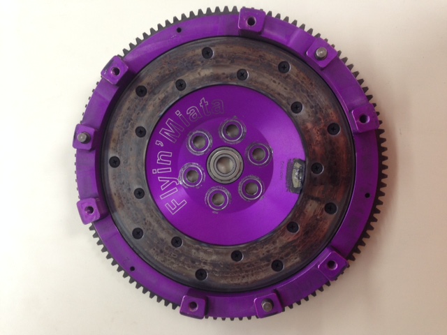 I'm selling my flyin Miata flywheel and clutch that came in the car when I bought it. The car made 250whp/200ftlbs on a supercharger setup and held power w/o problems. The flywheel bearing feels kind of rough, but doesn't have any play.