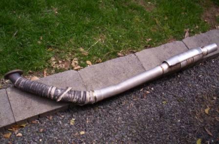 I have a gently used set of FM turbine outlet, FM downpipe, high flow cat (not sure if it is FM) and custom made exhaust and muffler. The cat is 2.5 inch both sides and is welded to the downpipe, as you can see from the pics. The turbine outlet is universal for all Garrett T25 turbo, but the downpipe was designed for the 1999-00 miata. The high flow cat, of course, is also universal.