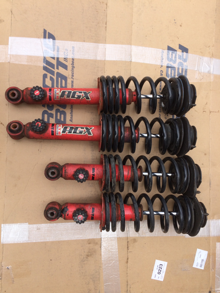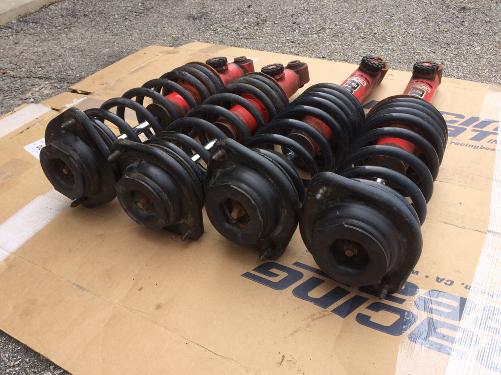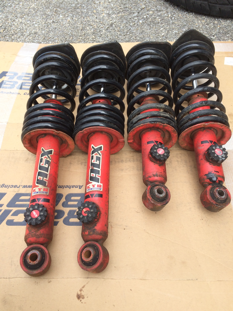I recently upgraded to Xidas, so it's time to bid my old suspension good bye. This set up includes NA tophats, bumpstops, Flyin' Miata springs and KYB AGX adjustable shocks from roughly 2005, with an estimated 50,000 miles on them. The springs have a little bit of paint over spray on them but are otherwise in good shape. The shocks have some superficial surface rust but don't leak and all the ***** turn.