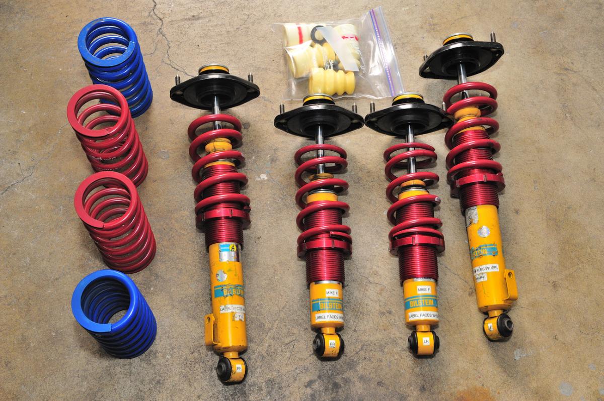 These came on a car I bought ~1 year ago with 500/300 springs. The shocks are valved for that spring rate. I'd guess they've seen about 2500 street miles and 7 track days. Worked fine when I pulled them off the car. The bump stops are older style from FCM so I bought a set of brand new bumpstops and spacers that are included for the buyer. Selling because I went to even stiffer springs and a different shock setup rather than getting these revalved.