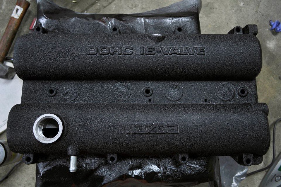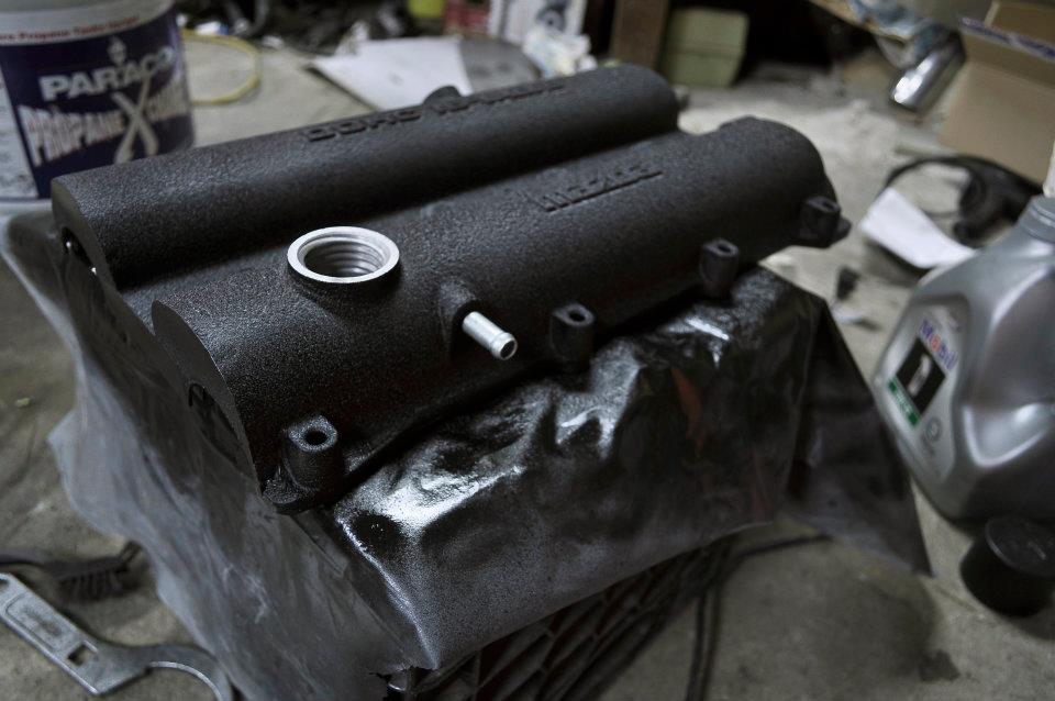 BP valve cover done wrinkle black (used VHT primer and VHT wrinkle paint), exposed cam gears, there is one spot on the back that didn't wrinkle up that can be seen in the pic of the rear. Comes with a clean used gasket and the grommet for the pcv valve: $old