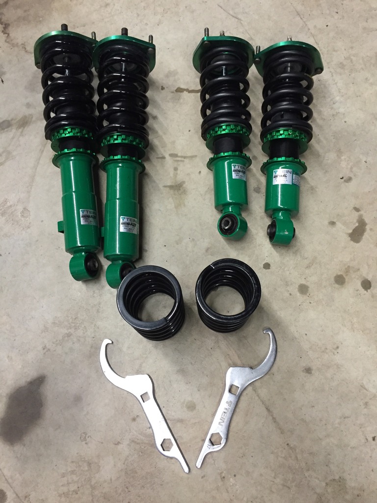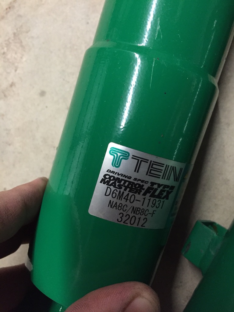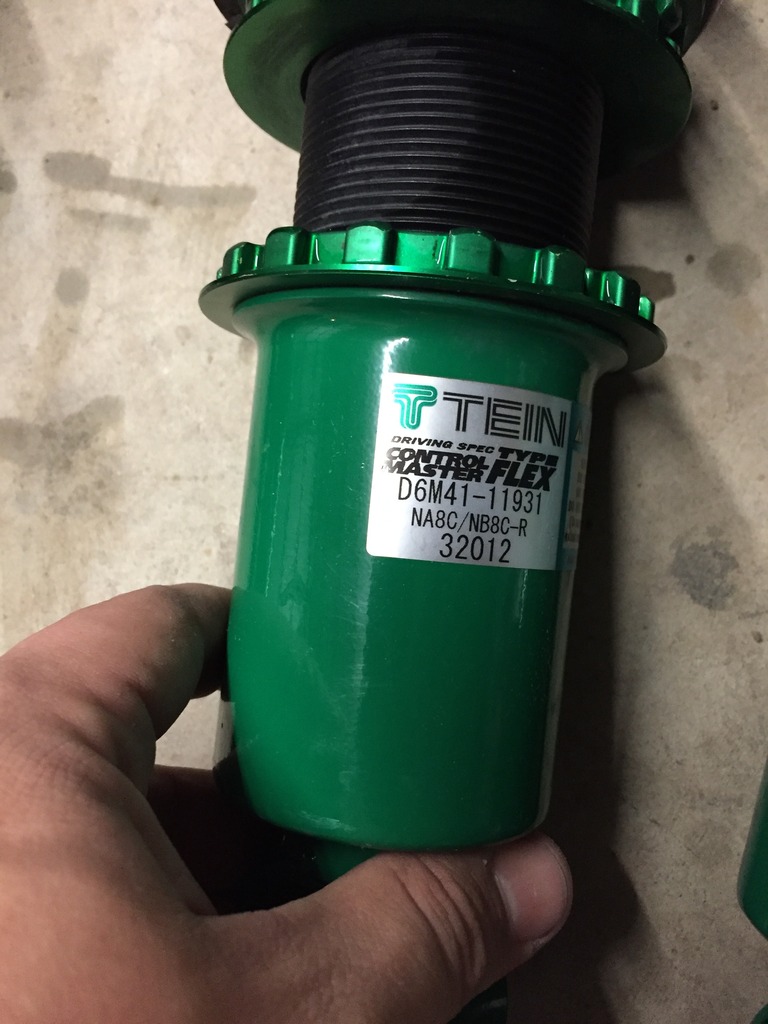 FS: Tein Control Master Flex suspension for the NA/NB Miata. 9kg front. 6kg rear. A few years old now, but only about 8,000 miles on the whole setup. Selling because my car has recently become my DD and I put a softer suspension on it. Great kit in like-new condition. A little surface rust on the threads of the shock rods (as seen in the pic of the top hat), but nothing serious. Rods themselves are shiny like new. All adjusters click nicely. My car was a fat pig, so I upgraded to a looser coil in the rear to prevent coil bind. I'm including the original Tein 6kg springs also in case you are lighter or decide to shed weight (because racecar).