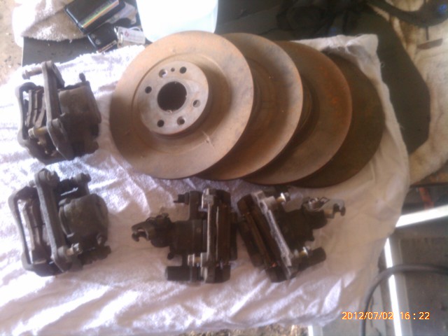 Includes pads, rotors, calipers, and brackets. I bought them for the rears, then got lazy.