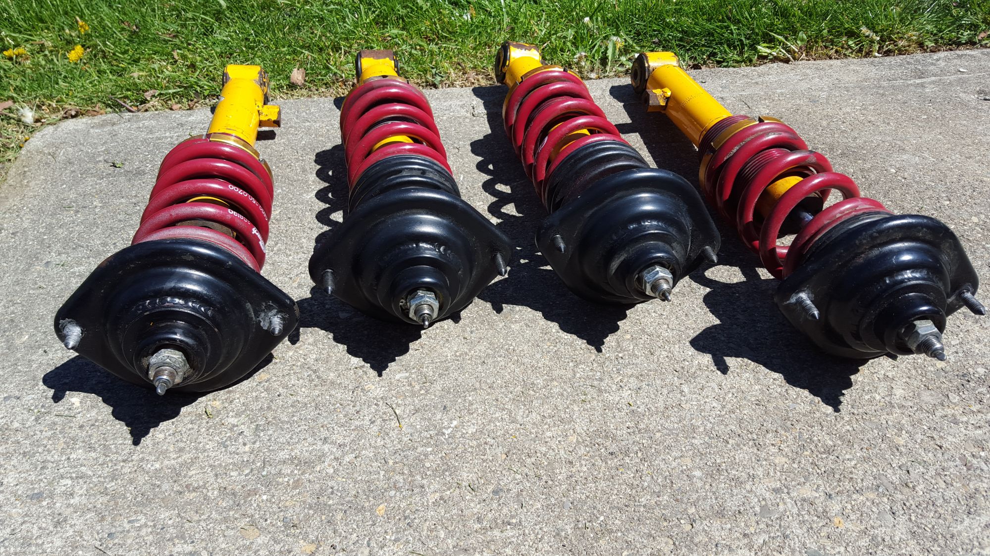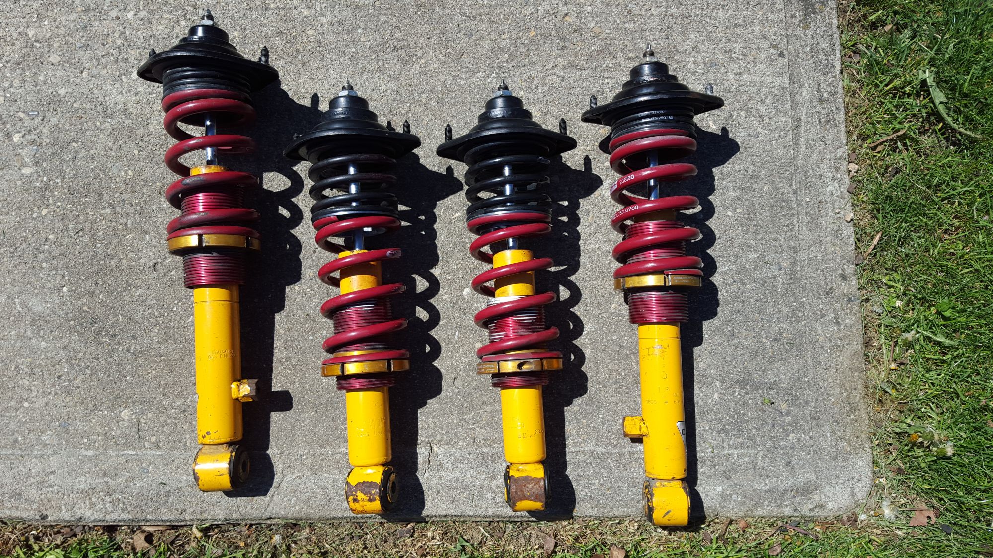 1) Front Koni race shocks (shortened and revalved) with GC sleeves and 700lbs 6" springs with additional tender springs (I believe they are around 150lbs). Includes Honda bumpstops.