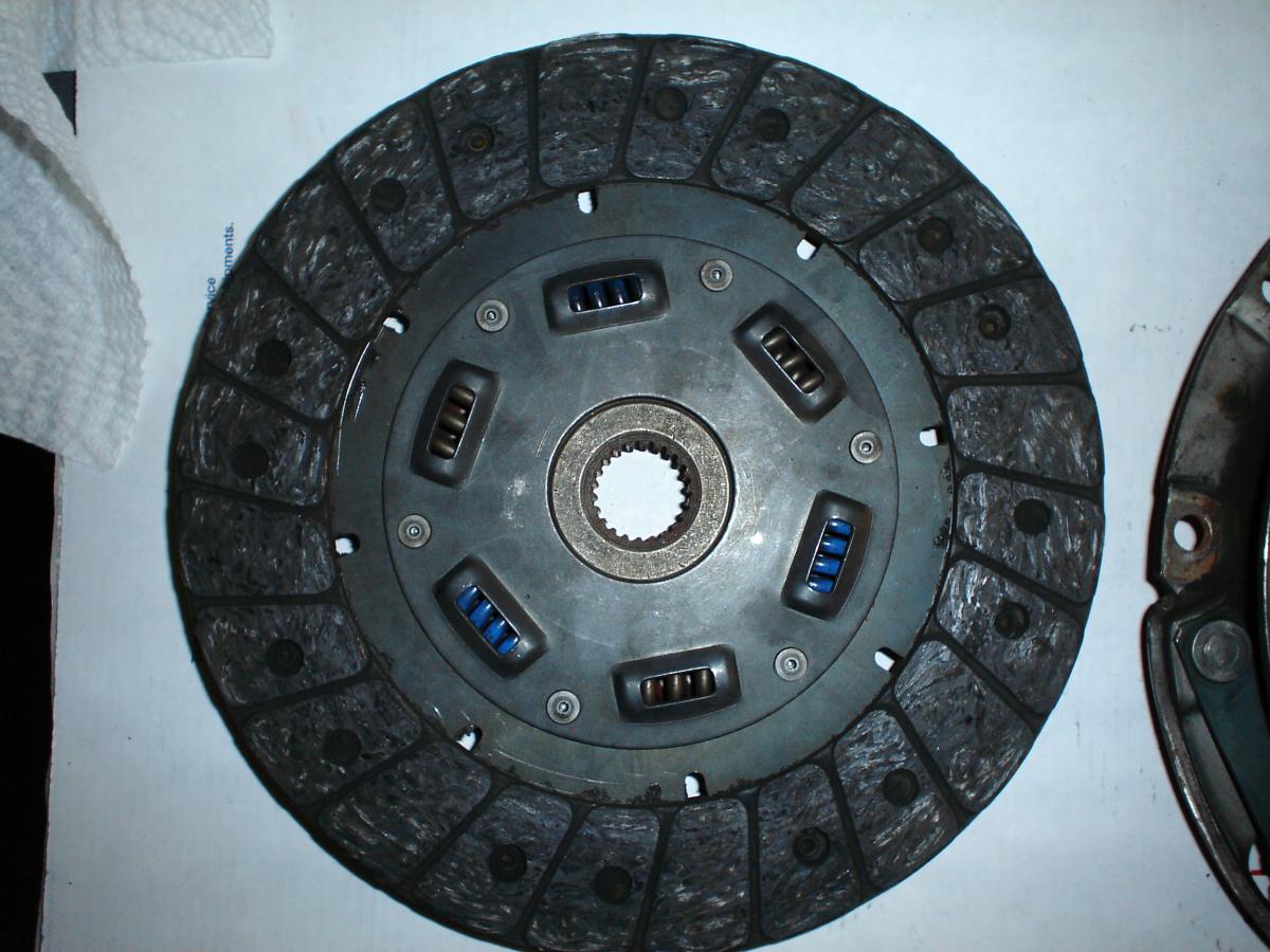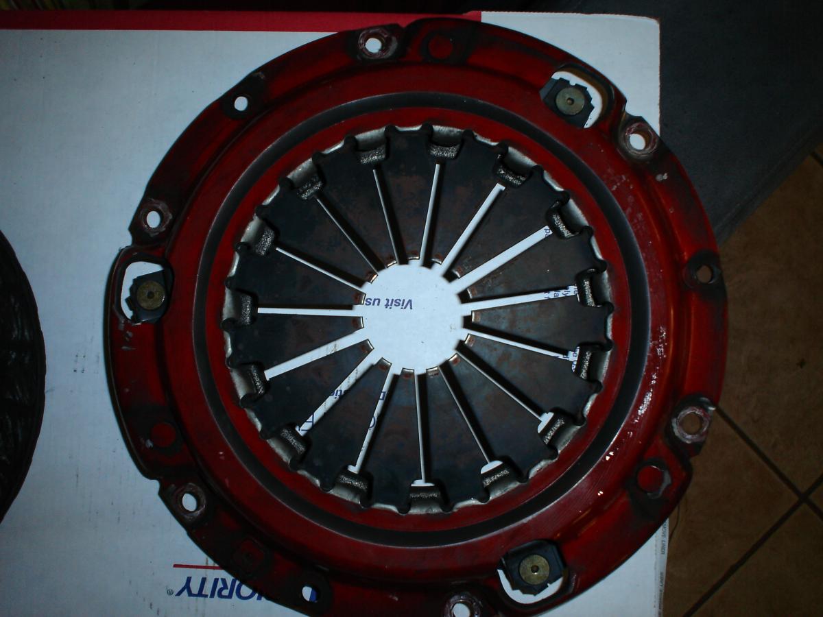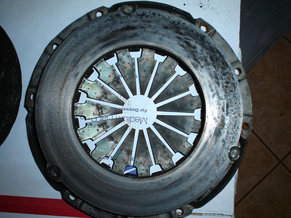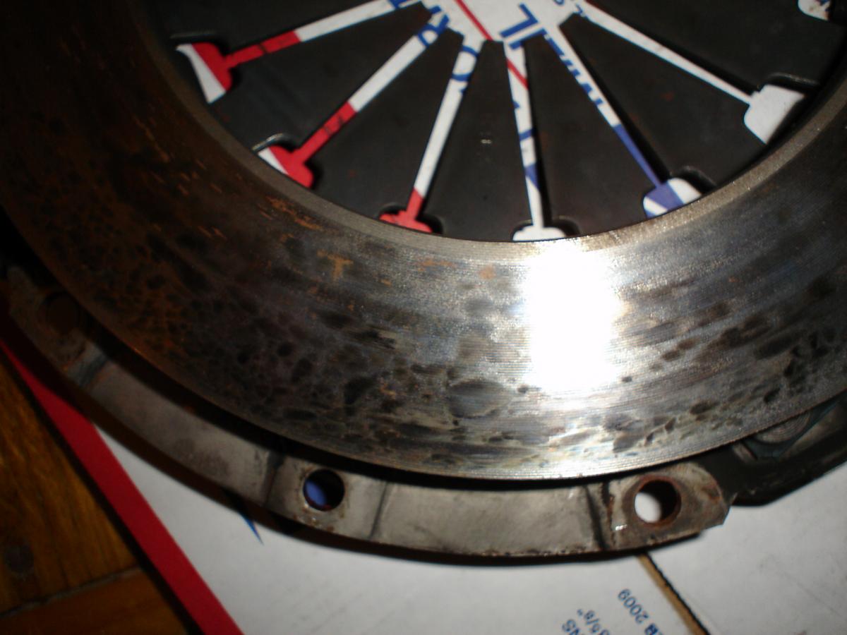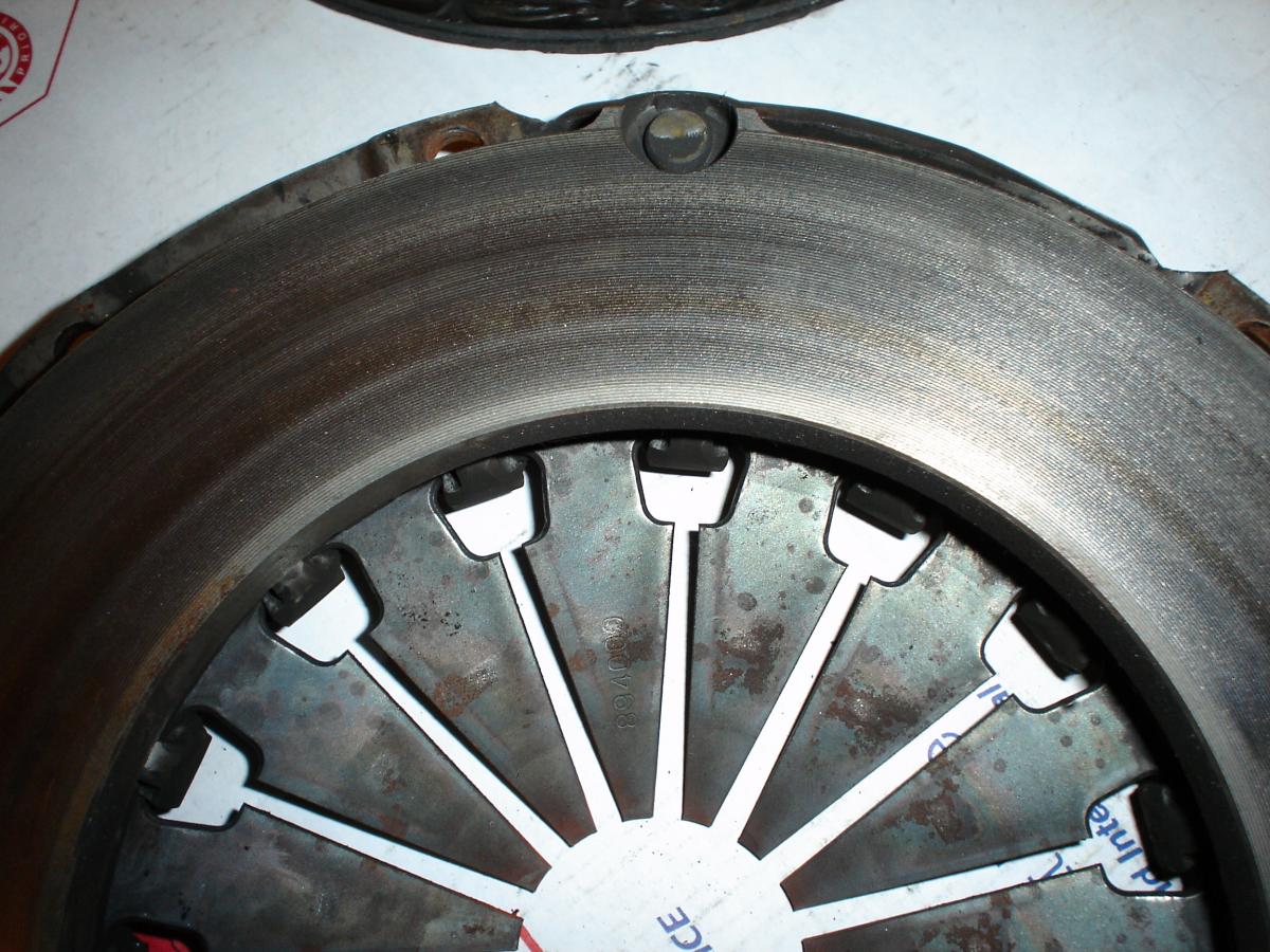 Clutch looks legit and milage looks true. Notice that the factory machining marks on the pressure plates friction ring are still very visble. The heat marks are normal within the first hundred miles or so too. The dirt and dust on pressure plate is caused from clutch slip/break-in during normal city driving.