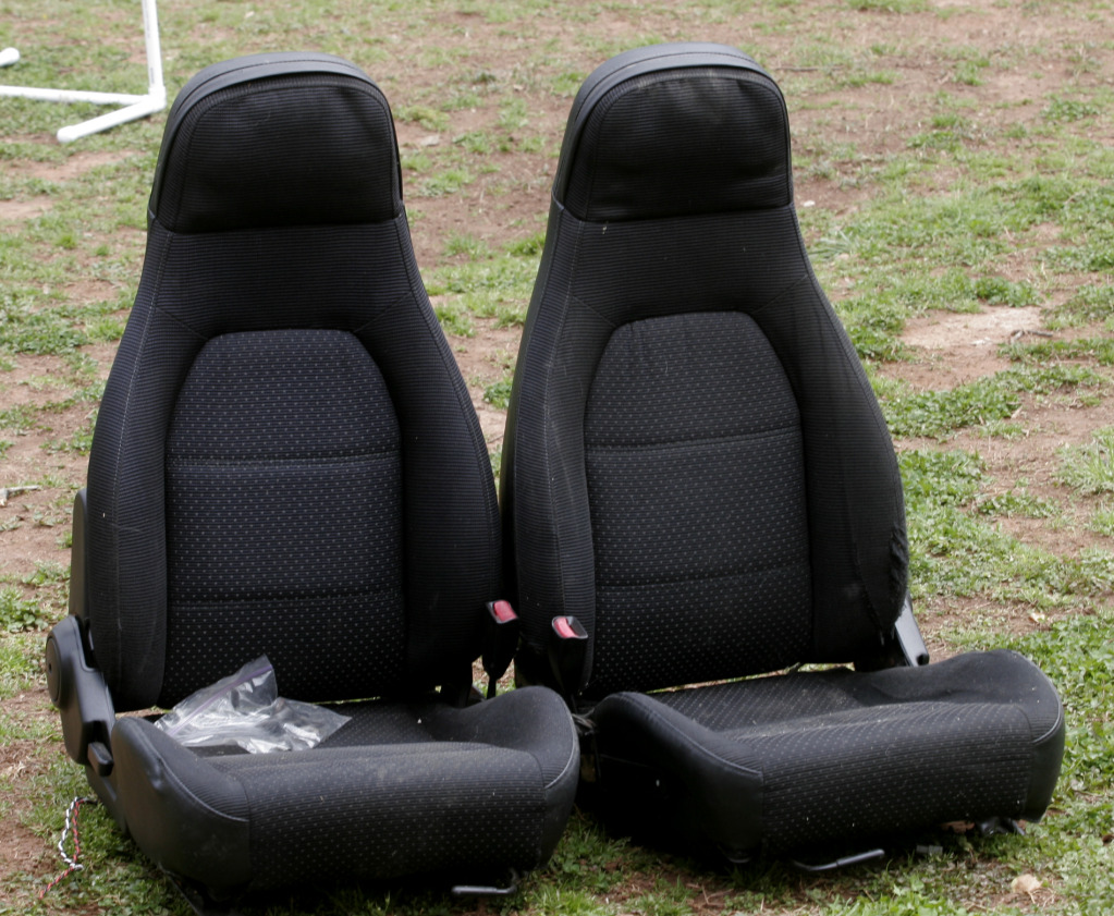 Seats. They are dusty but in good shape. The passenger side looks very good. The drivers side is frayed a little where the seat belt rubbed. The selling point on these is thay have new head rest speakers and wiring harness. I had the speakers just installed and then found some leather seats.