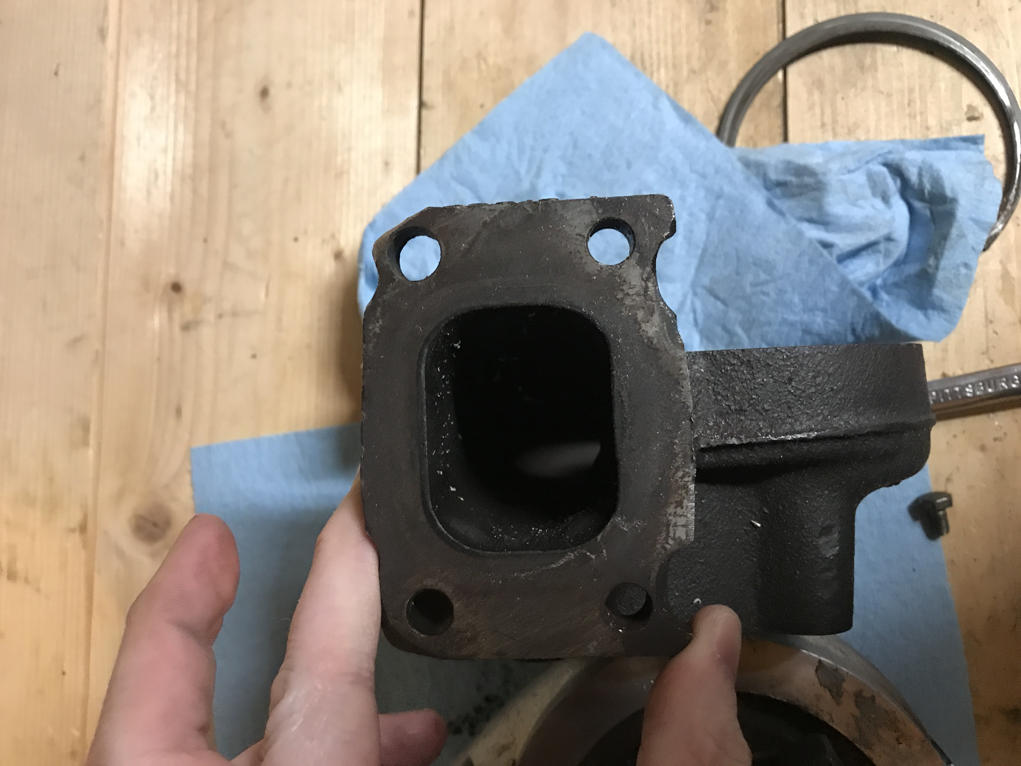 It does have one bolt hole on the outlet side that was damaged. A machine shop drilled the hole but it needs to be tapped! Because of that I am discounting it.