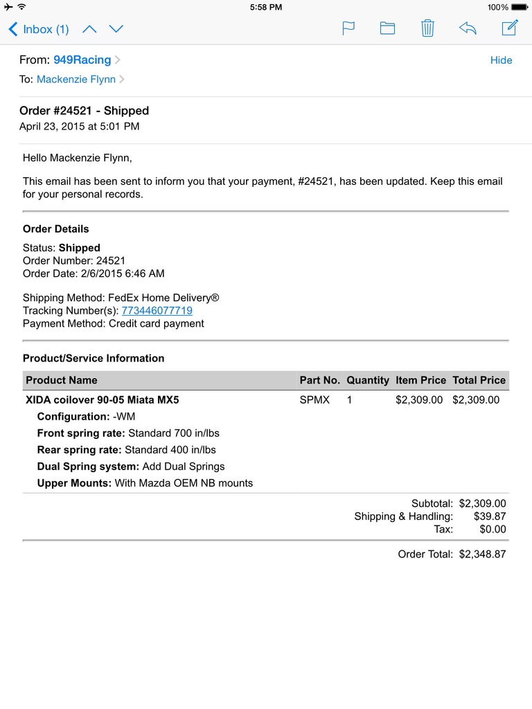 Pricing Change EDITED!!!!!!Since most people will want the paypal guarantee as previously pointed out by other people. I have decided to eat the paypal fee but not include shipping. I get good rates because of how many packages ship a day so should average between $20-$30 depending on where you live. My Miata is getting taken over by a new project car. Unfortunately that means some really exspesnive parts that I bought only a few months ago need to go bye bye. All parts are negotiable and bare with me, the coilovers will come off Friday as well as the FFD wheels so I will not ship until monday the 8th. email or pm me. Email mackenzieflynn17@me.com