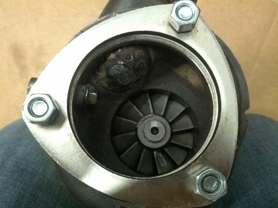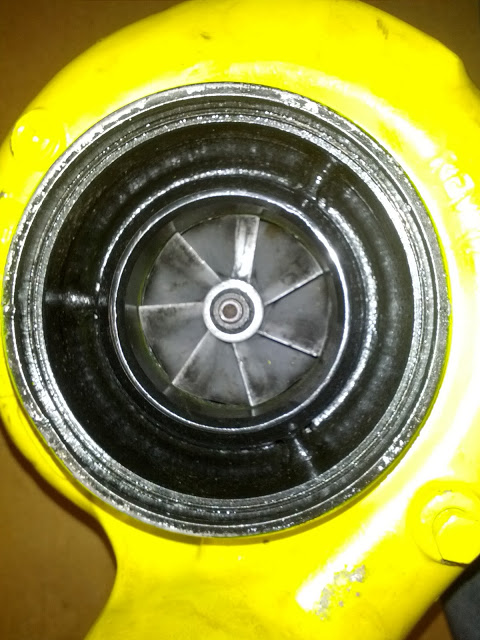 The compressor housing was painted ricer yellow, the stock wastegate system is unusable and flapper has been welded up. The exhaust flange has also been modified from what I believe was originally a v-band to now what I think is just a regular *** 3 bolt exhaust flange.