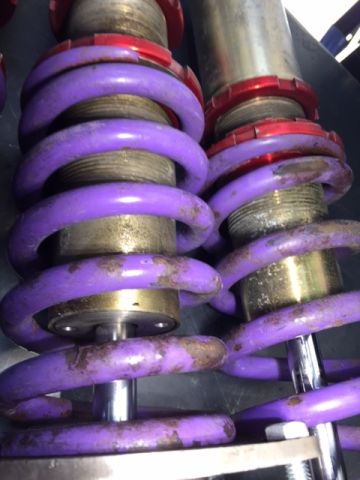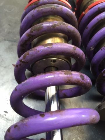 I pulled off the spring and they are 12k front and 9k rear (672/504 lb/in). I tested each shock by compressing it and they all had smooth compression and rebounded properly. I inspected the shocks closer and there are no leaks. Just loose dirt from the occasional off track adventure.