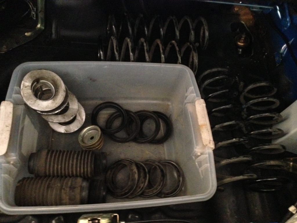 I also have a box of left over parts from the NB Bilstein setup. 4 springs, 4 lower spring rubber isolator, 4 upper rubber spring isolators, 4 shock boots, 4 aluminum spring mounts, and 4 lower washers. I have NOTHING else left from the stock NB sport coilover setup. All the rubber pieces are a little dirty, but no tears in any of them.