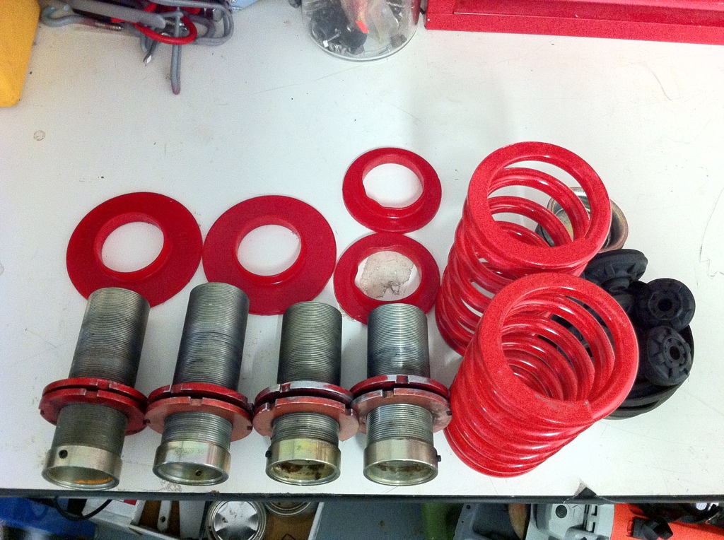 As the title sayes, these are the coil-over sleeves that came with the koni-yellow coil-over kit. They bottom out of the c-rings that yellows come with and then stay in place with a set screw. They are made for 2.25" springs but koni sets a 2.25" to 2.5" adapter for a few bucks each corner. Also included will be some ebay 2.5" springs..~500lbs from what is known about them which will work up-front. Some ES spring isolators will also be included with the sale. The larger isolators are for up front and need to be trimmed to fit
