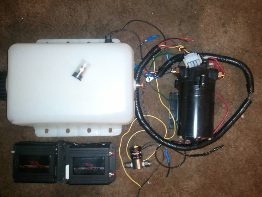 Selling my water meth kit. Labonte Motorsports controller and fail safe. Pump has had original fittings with plastic releases replaced by brand new all-metal fittings. Has tank, looks like its about 3/4 gallon tank, and a brand new 3GPH nozzle from Devil's Own. All that is missing for this kit is lines and a few wires, and methanol of course. Asking $180 for everything picked up if you want me to ship it will probably be around $20 since this all fits into a large flat rate box.