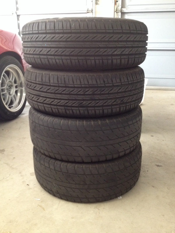 Stock miata daisy's: All 4. Two have almost new tires, the other two have maybe 10% tread. I don't know how much these go for, make an offer. Preferably, these would be picked up. For some reason, they come pre-glittered.