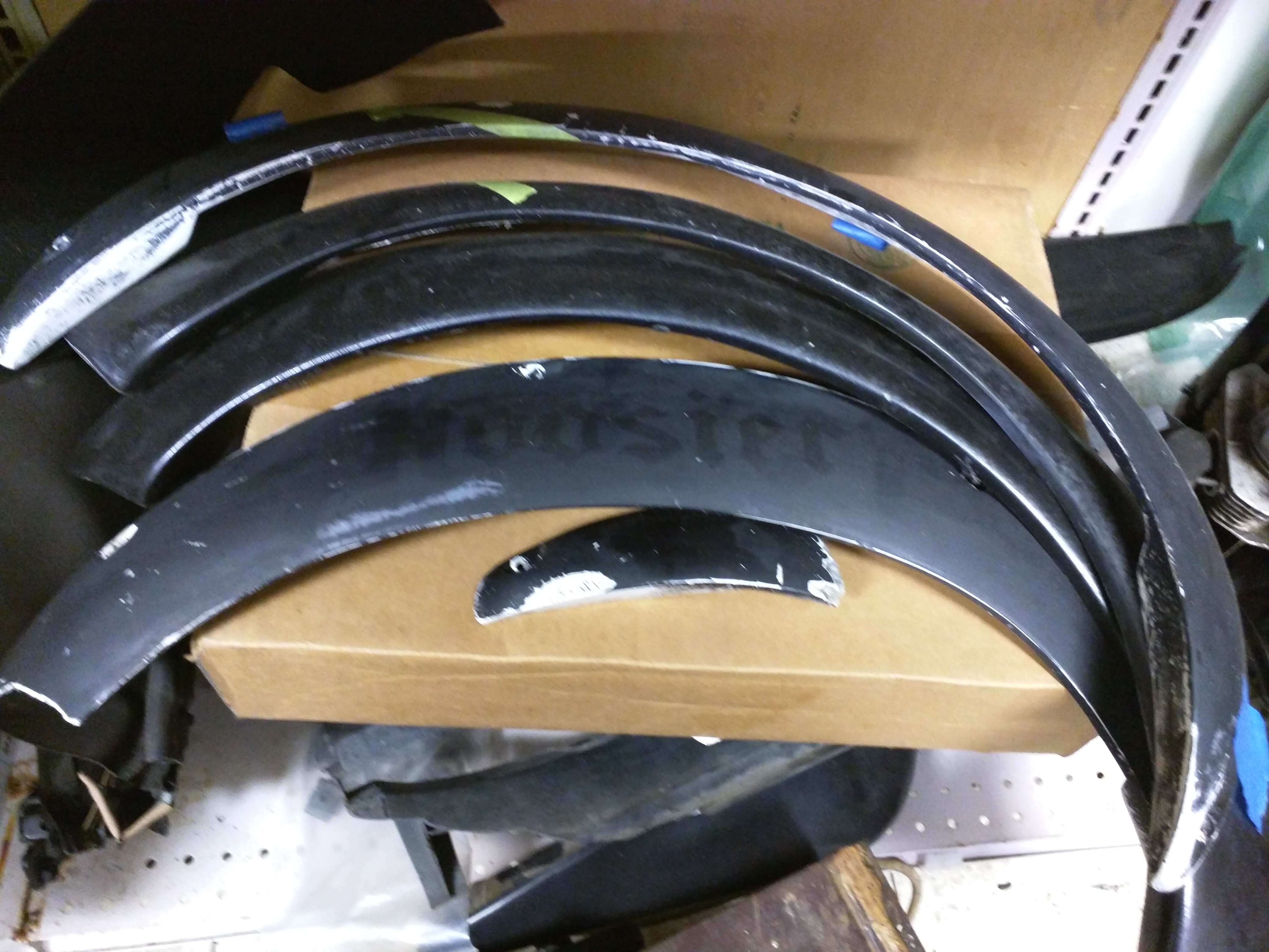 Autokonexion V1 Flares - $100 - 40mm extra clearance for 15x11s and 275 Hoosiers. Fronts came off an autocross car, and look like it. Will need a corner epoxied back on and some reinforcement/ paint. Rears are new, but are of a newer design, and will need fitting.