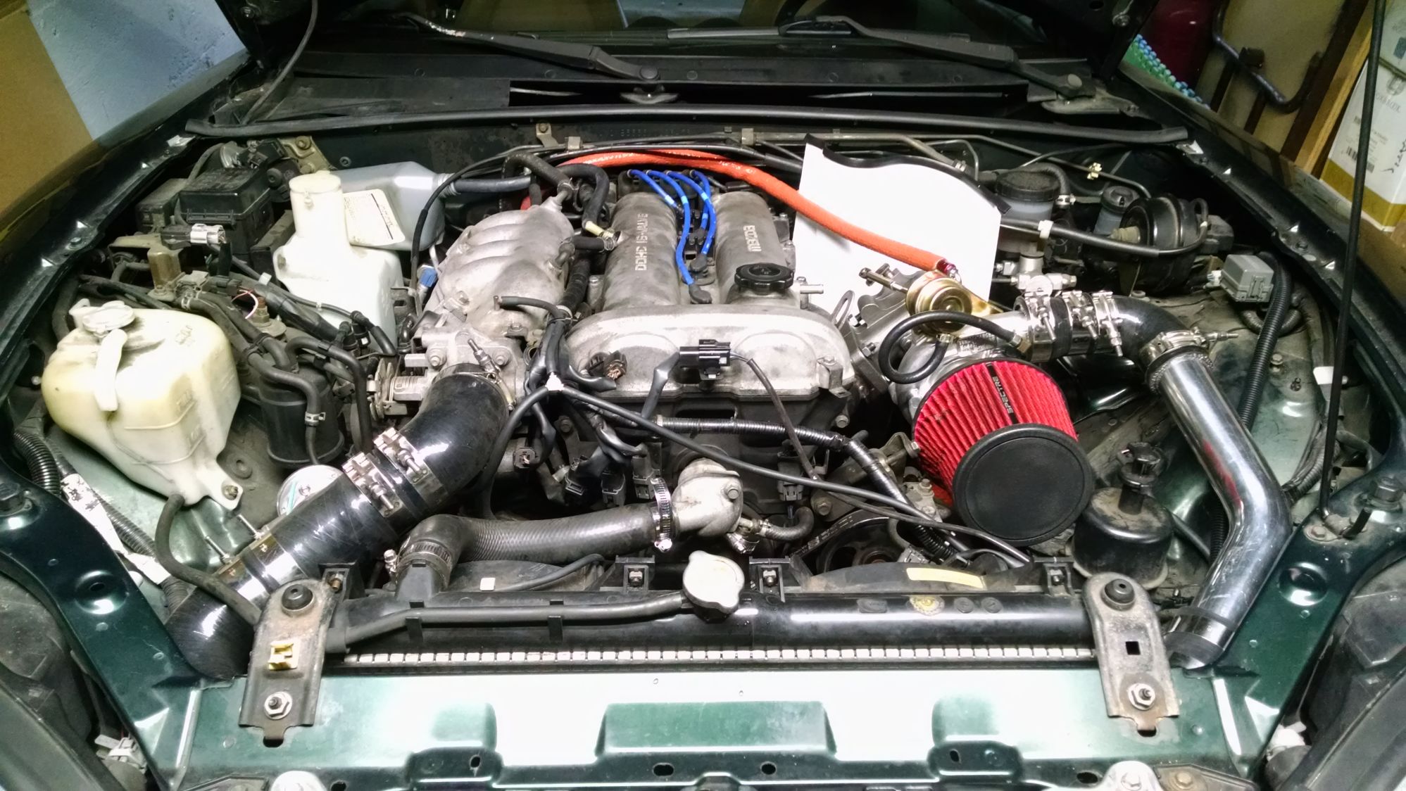 Finally got everything back together, just need to lower the car put the bumper back on and add fluids. Everything fit very well, no problem with the a/c compressor or the power steering pump. I will post a few pictures and there will another one of us running this turbo soon.