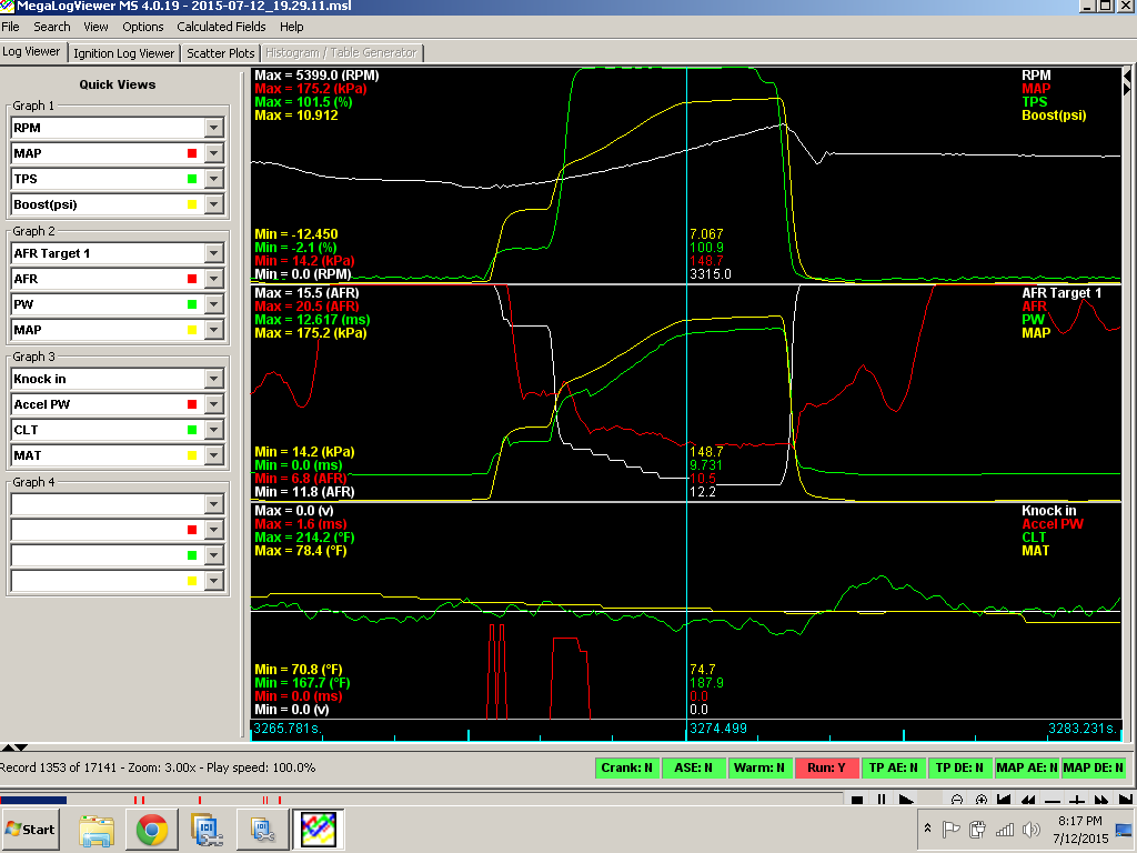I didn't even get past 5k rpm, still taking it easy as that was the first test drive, not to mention my waste gate is running directly off the compressor housing. I had to make sure I didn't forget to tighten something. I plan to take it out again later today, already adjusted some boosted cells but I was at about 10:1 in boost so it will still be pretty rich.