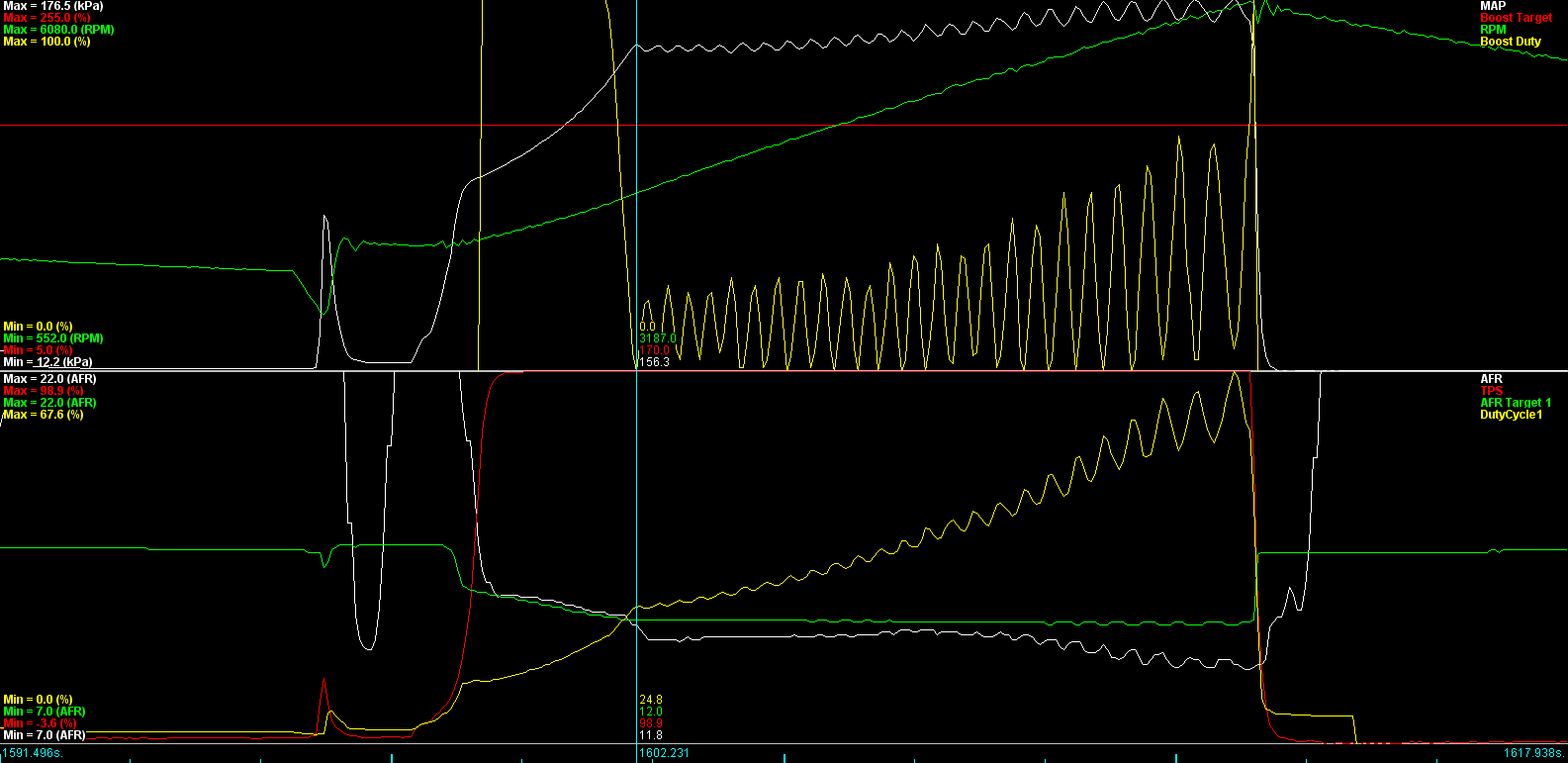 Here's before I played with EBC. I turned my wastegate preload way down because I can't remember, it still does not blow the gate open, nor does it creep. There's boost DC changes in this log, but the signal to the solenoid is interrupted.