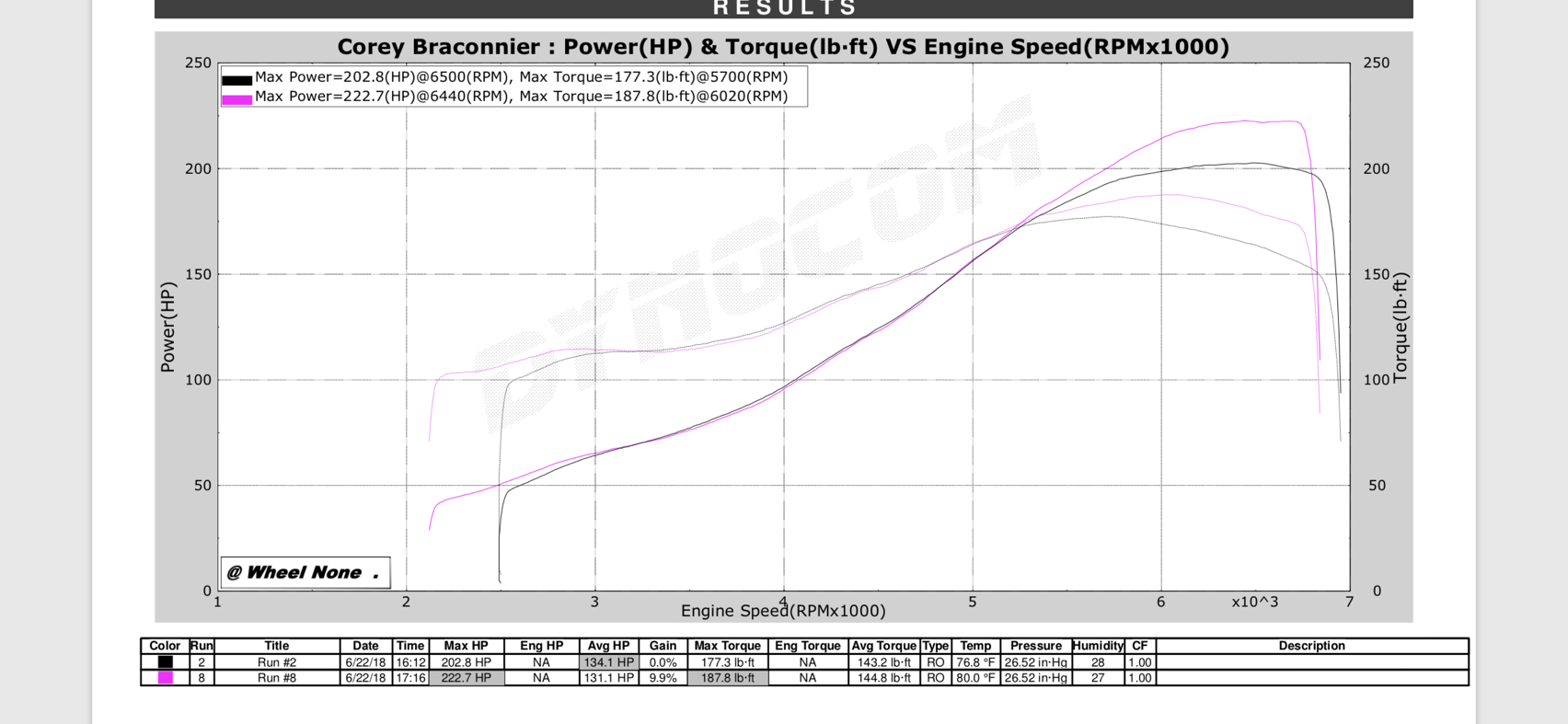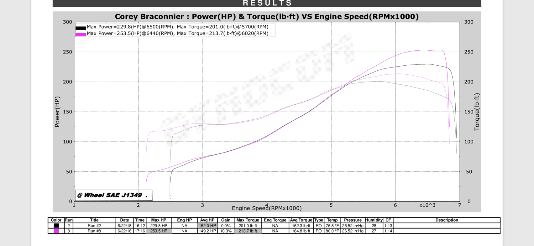When I had my car on the dyno (mk turbo intercooler plus electronics kit) I had an issue with the wastegate and at 10.5 psi it made 220whp with altitude correction it was 250whp. both of these runs are the same just comparing corrected vs uncorrected. I'm currently at 14 psi not sure the power it's making now as I had it street tuned after figuring out my wastegate issue
