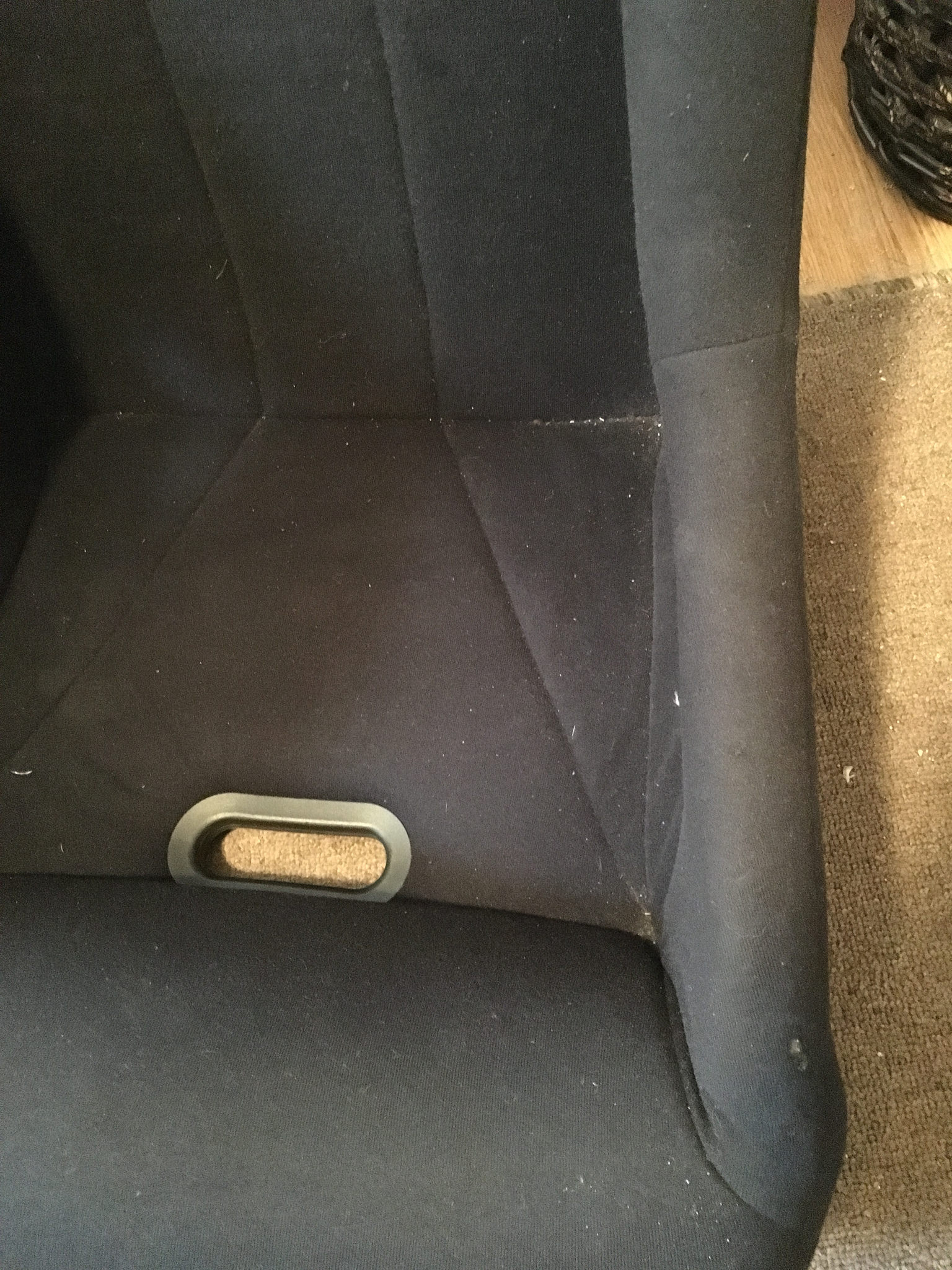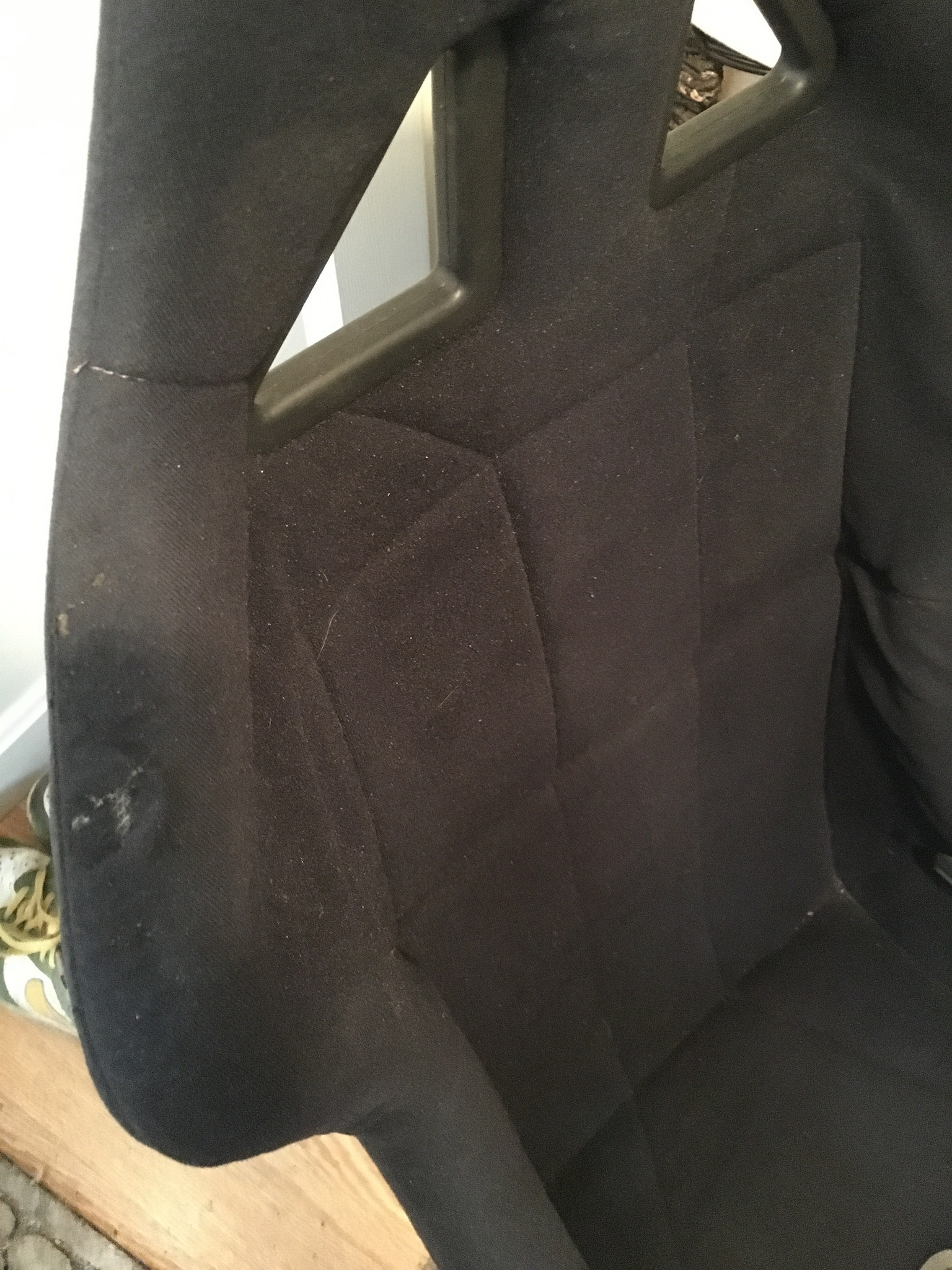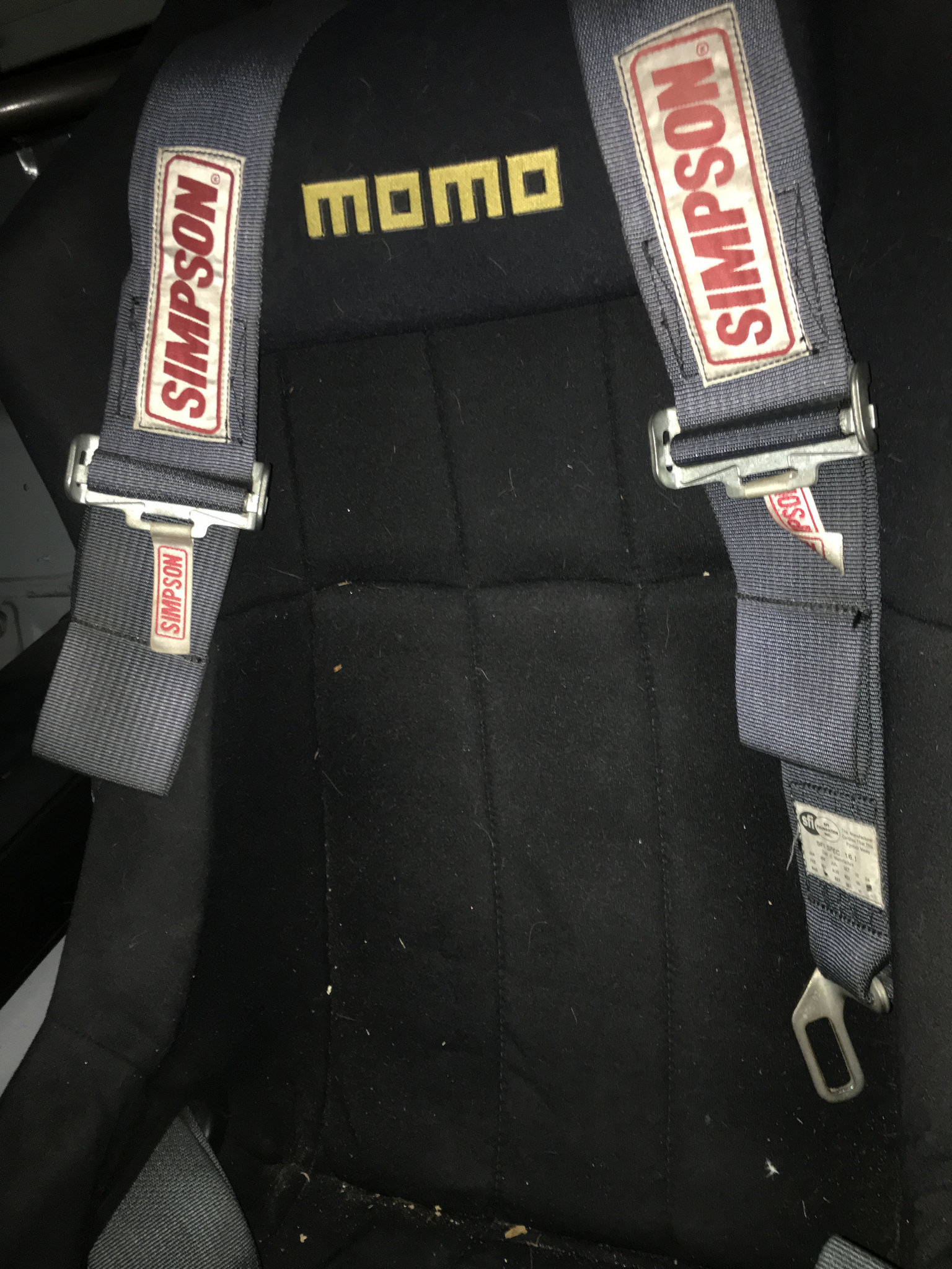 $160: Selling a used Momo T-frame seat and a used Simpson 5 pt harness. Seat has some wear as shown in the pics. This is a bottom mount seat, and can bolt directly to miata rails by drilling 1 hole on the back of the sliders (how I had it done). Camera flash makes the edges look brown, but they are black. Selling without sliders- just the bare seat. Sawdust will be cleaned up before sale!