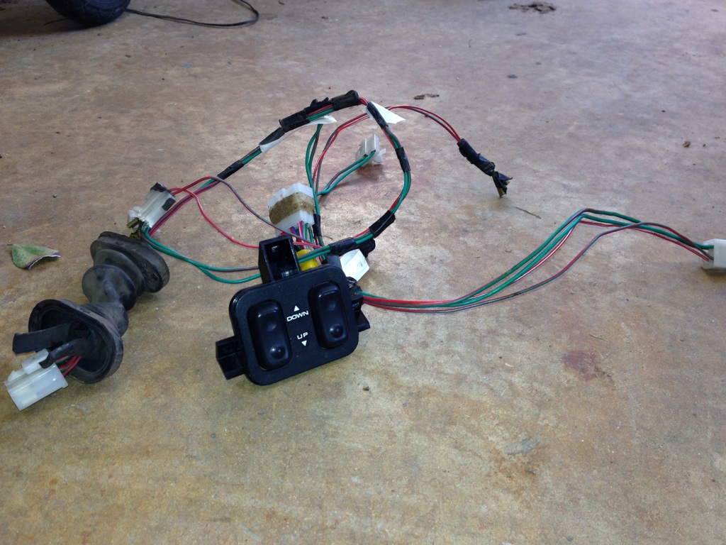 Power window Harnesses from motors to kick panels and window switch. depending on your year (1996-1997 i think) its plug and play to convert to power windows… (one harness has been cut to make it easier to get through the door, its just 2 wires…) all you'll need is motors/regulators. 40$ shipped.